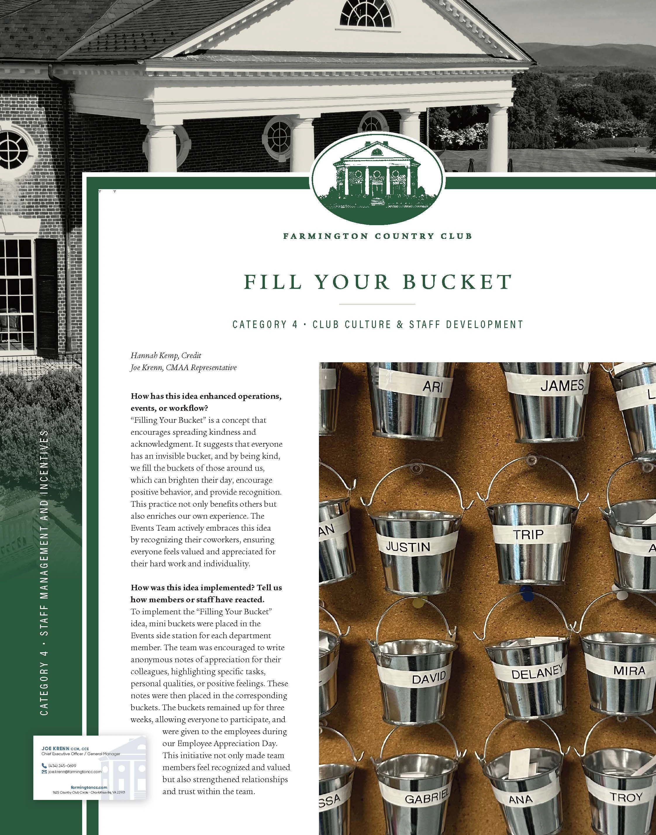 To implement the “Filling Your Bucket” idea, mini buckets were placed in the Events side station for each department member. The team was encouraged to write anonymous notes of appreciation for their colleagues, highlighting specific tasks, personal qualities, or positive feelings. These notes were then placed in the corresponding buckets. The buckets remained up for three weeks, allowing everyone to participate, and were given to the employees during our Employee Appreciation Day. This initiative not only made team members feel recognized and valued but also strengthened relationships and trust within the team.