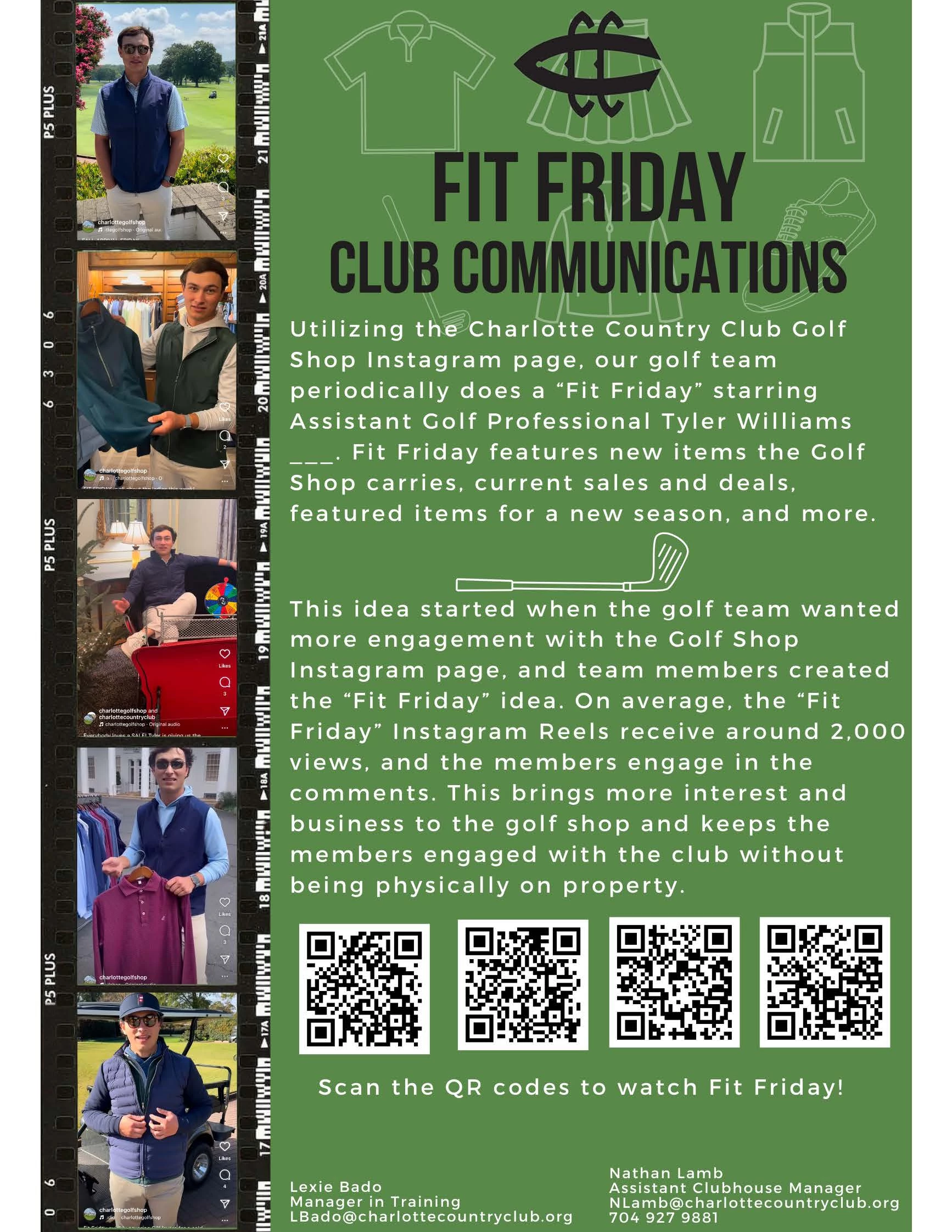 Tyler, alongside other golf teammates of CCC, has posted over a period of August 2024 through December of 2024 - garnering, on average, 2000 views per post. Fit Friday videos have become a phenomenon around the club, with all members looking forward to knowing the new golf shop arrivals without having to drive to the club and step foot in the shop. These videos have accumulated a "know before you go" feeling around shopping at CCC - something that has boosted soft good sales and convenience - especially around a busy holiday season!