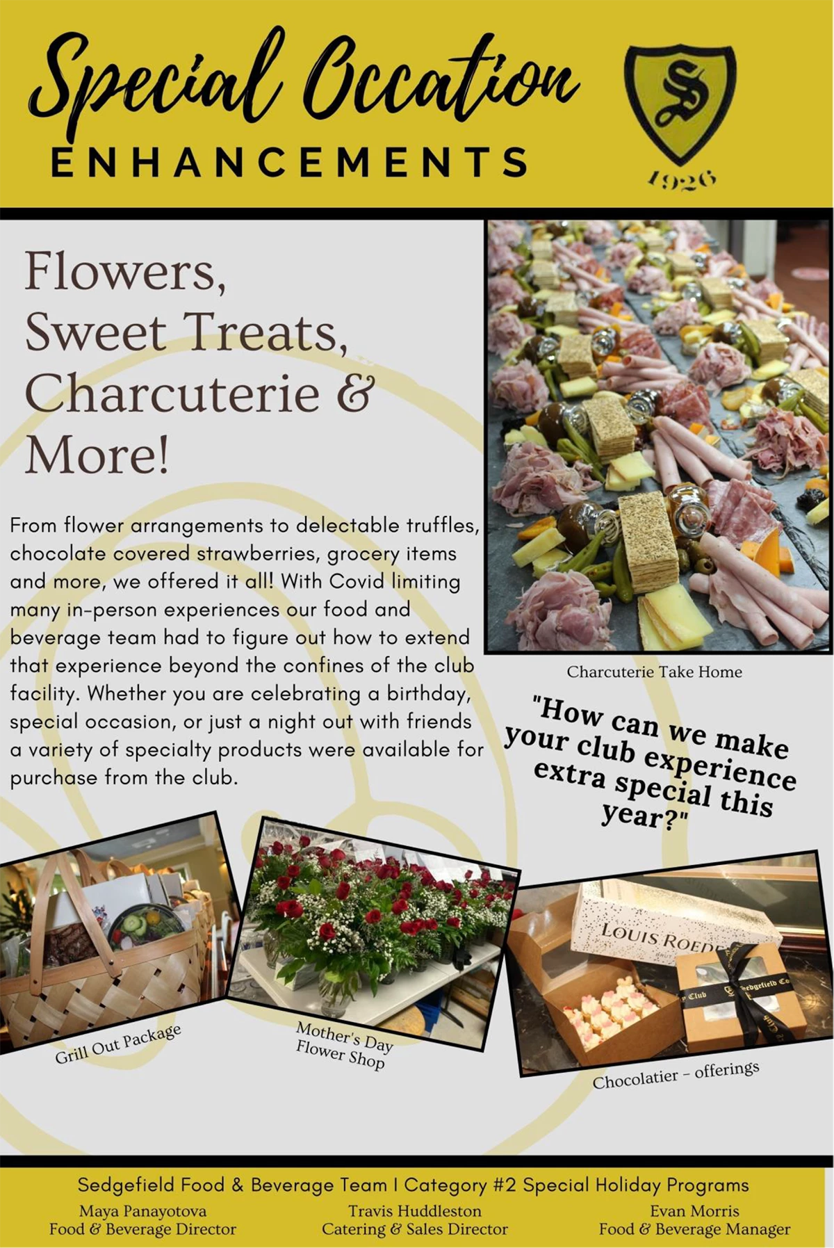 The Food and Beverage team worked together to obtain all necessary products to create and promote these special enhancements. All offerings were promoted through emails, social media and club newsletters. We sourced flowers from a local wholesale distributor and created all flower arrangements in house. The culinary team sourced slates for charcuterie boards along with artisanal meats, cheeses and many other accoutrements. Hand-crafted desserts were prepared in house and packaged carefully for pick-up and delivery.