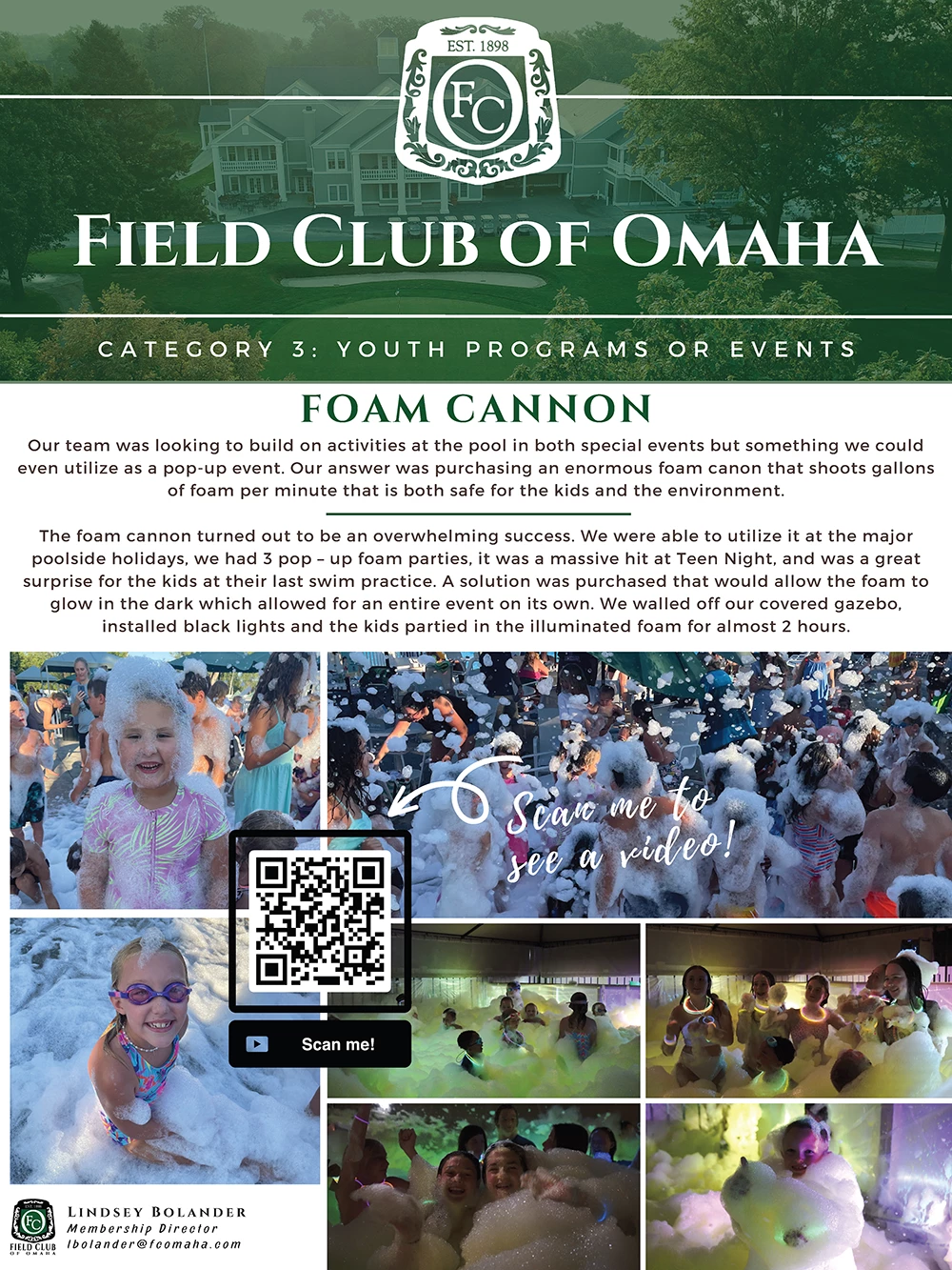 Our team was looking to build on activities at the pool in both special events but something we could even utilize as a pop-up event. Our answer was purchasing an enormous foam canon that shoots gallons of foam per minute that is both safe for the kids and the environment.