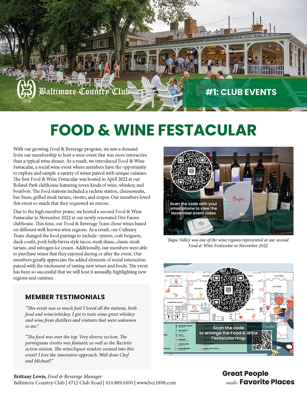 With our growing Food & Beverage program, we saw a demand from our membership to host a wine event that was more interactive than a typical wine dinner. As a result, we introduced Food & Wine Festacular, a social wine event where members have the opportunity to explore and sample a variety of wines paired with unique cuisines. The first Food & Wine Festacular was hosted in April 2022 at our Roland Park clubhouse featuring seven kinds of wine, whiskey, and bourbon. The food stations included a raclette station, cheesesteaks, bao buns, grilled steak tartare, risotto, and crepes.