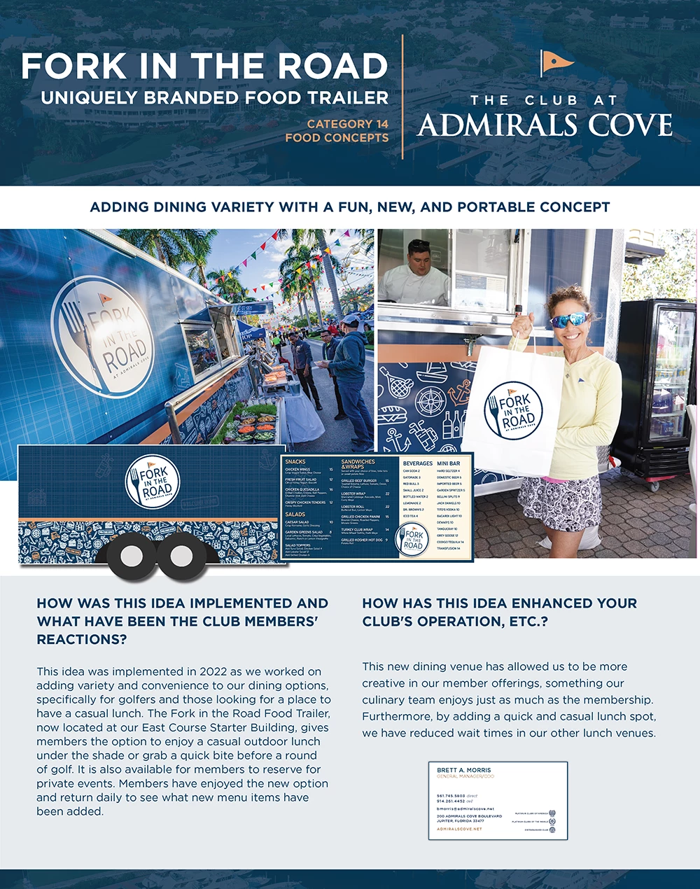 This idea was implemented in 2022 as we worked on adding variety and convenience to our dining options, specifically for golfers and those looking for a place to have a casual lunch. The Fork in the Road Food Trailer, now located at our East Course Starter Building, gives members the option to enjoy a casual outdoor lunch under the shade or grab a quick bite before a round of golf. It is also available for members to reserve for private events. Members have enjoyed the new option and return daily to see what new menu items have been added.