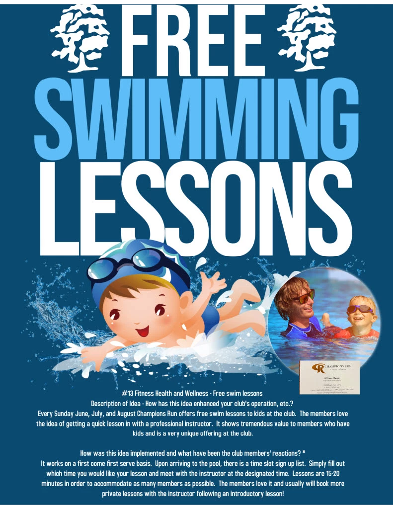 Every Sunday June, July, and August Champions Run offers free swim lessons to kids at the club. The members love the idea of getting a quick lesson in with a professional instructor. It shows tremendous value to members who have kids and is a very unique offering at the club.