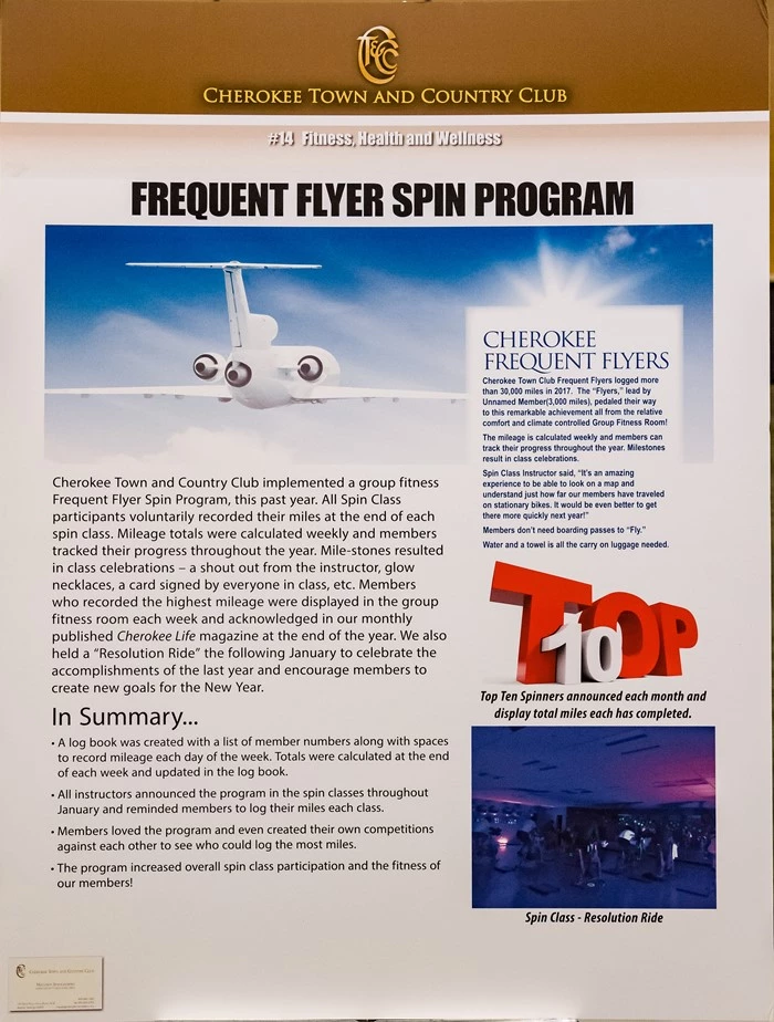 The CTCC Frequent Flyer Spin Program is a group fitness program that we implemented this past year. Beginning in January, all Spin Class participants voluntarily recorded their miles at the end of each spin class. Mileage totals were calculated weekly and members tracked their progress throughout the year. Mile-stones resulted in class celebrations – a shout out from the instructor, glow necklaces, a card signed by everyone in class, etc. Members who recorded the highest mileage were displayed in the group fitness room each week and acknowledged in our Cherokee Life Magazine at the end of the year. We also held a "Resolution Ride" the following January to celebrate the accomplishments of the last year and encourage members to create new goals for the New Year.