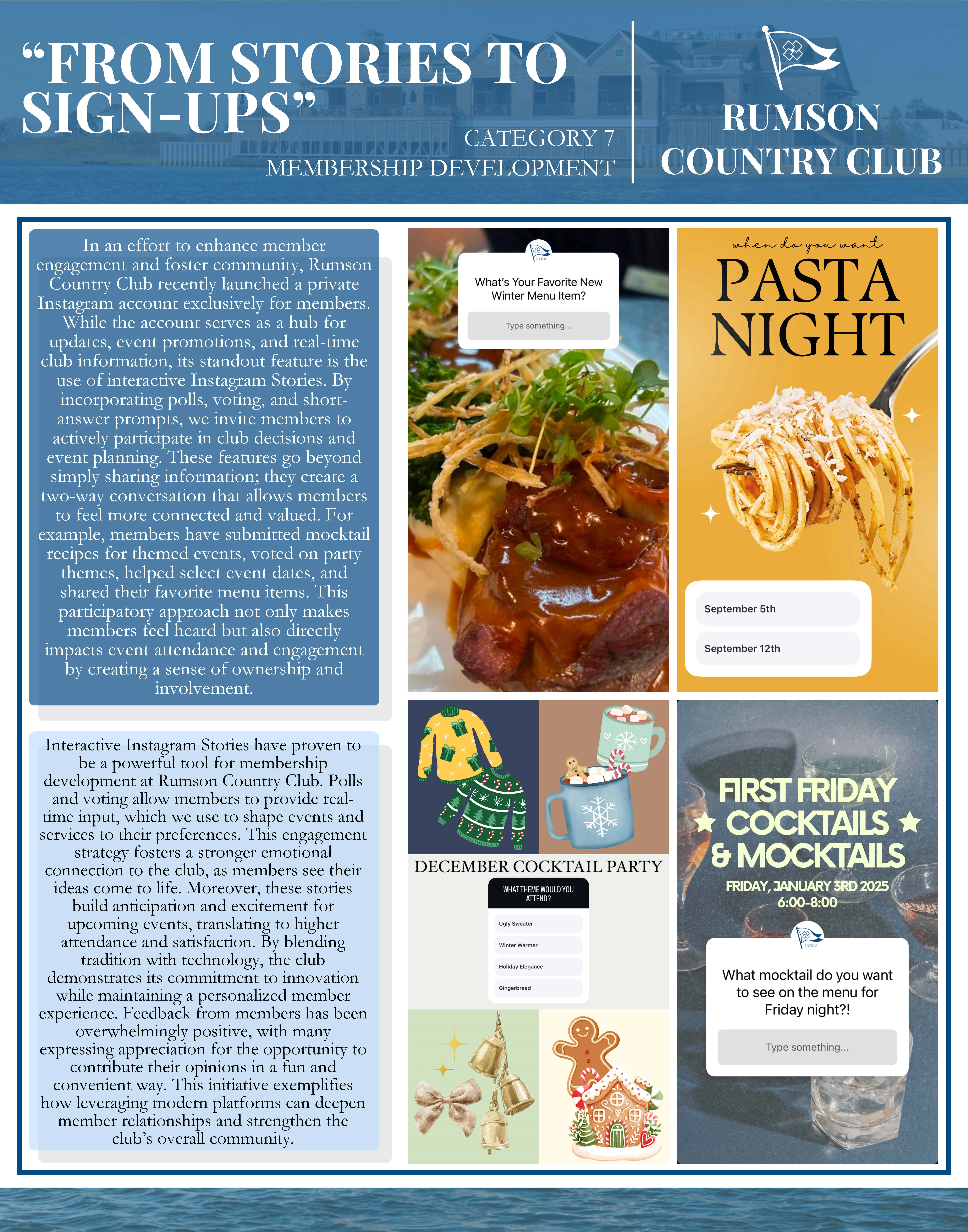 In an effort to enhance member engagement and foster community, Rumson Country Club recently launched a private Instagram account exclusively for members. While the account serves as a hub for updates, event promotions, and real-time club information, its standout feature is the use of interactive Instagram Stories. By incorporating polls, voting, and short-answer prompts, we invite members to actively participate in club decisions and event planning. These features go beyond simply sharing information; they create a two-way conversation that allows members to feel more connected and valued. For example, members have submitted mocktail recipes for themed events, voted on party themes, helped select event dates, and shared their favorite menu items. This participatory approach not only makes members feel heard but also directly impacts event attendance and engagement by creating a sense of ownership and involvement.