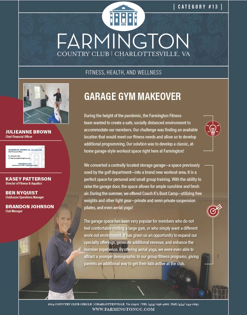 During the height of the pandemic, the Farmington Fitness team wanted to create a safe, socially distanced environment to accommodate our members. Our challenge was finding an available location that would meet our fitness needs and allow us to develop additional programming. Our solution was to develop a classic, at-home garage-style workout space right here at Farmington!
