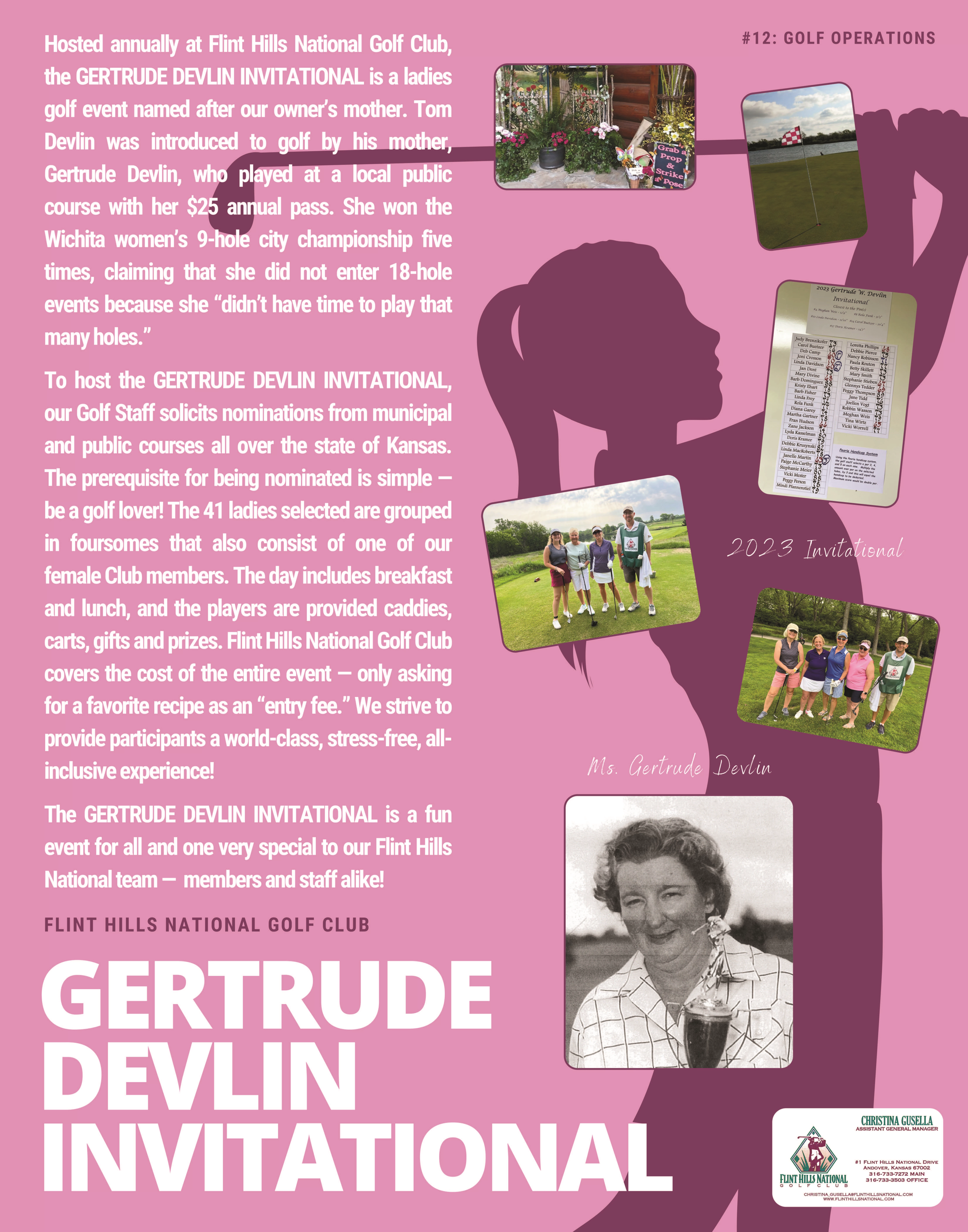 The Gertrude Devlin Invitational is an annual community-focused golf tournament here at Flint Hills National Golf Club named after our owner's mother. Ms. Gertrude Devlin was a lifelong lover of and advocate for the name of golf. We invite 41 die-hard golf-loving ladies from all over the state of Kansas to play in the Gertrude Devlin Invitational, hosting different participants each year. We treat the ladies to breakfast and lunch, caddies, carts, gifts and prizes, plus discounted lodging/practice rounds, if desired. Tom Devlin, our aforementioned owner, recalls a participant asking him if he remembered the old television show ‘Queen for a Day.’ He said he did, and she responded, “Well, that’s what I feel like when I come here.” This is a huge compliment for us and highlights the significance of this event for all involved. Hosting a golf tournament with a strong emphasis on community outreach enhances our operation in many ways. Beyond the competitive spirit on the golf course, the Gertrude Devlin Invitational serves as a powerful platform to strengthen ties with the local community and fosters a sense of goodwill. As one of many private clubs in the area, there is a unique, symbiotic relationship between us and the surrounding community, leading to enhanced operations and a more vibrant, socially responsible club environment.