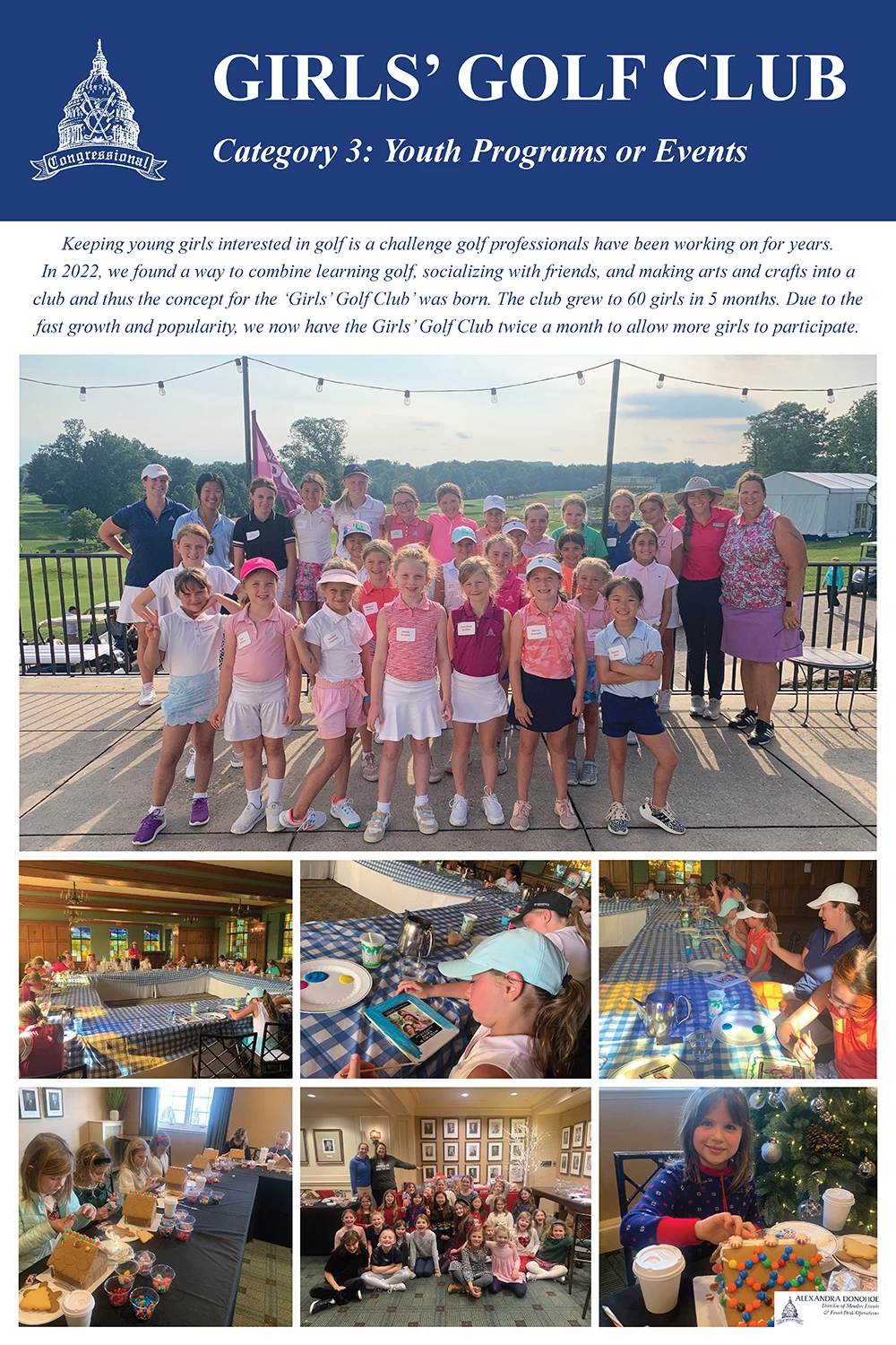 Keeping young girls interested in golf is a challenge to golf professionals have been working on for years. In 2022, we found a way to combine learning golf, socializing with friends, and making arts and crafts into a club and the concept for the ‘Girls’ Golf Club’ was born. The Girls Golf Club meets for a two hour gathering once a month. During the first half the focus is on the short game and full swing instruction with games. The second half is arts & crafts while socializing over food and drinks. Some of the projects have included painting picture frames, "I AM" posters, thank you and birthday cards, friendship rocks and building gingerbread houses. During our December Girls’ Golf Club, we had a Holiday Party when each girl brought a gift to donate to the Children’s National Hospital Gift Closet. They also decorated cookies and did a gift exchange.