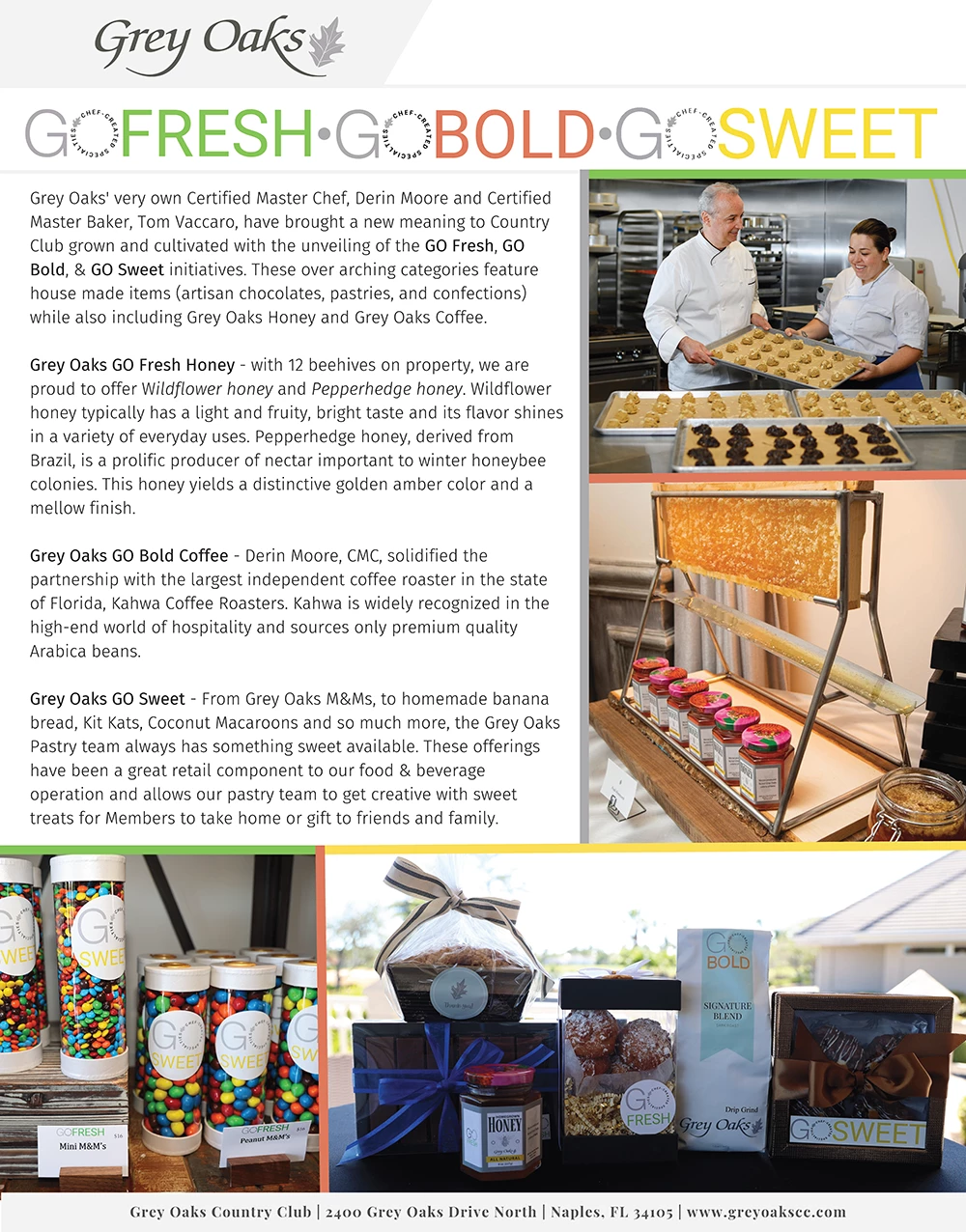 This idea came from our Director of Culinary, Derin Moore, CCM and Executive Pastry Chef, Tom Vaccaro, CMB, based on their previous culinary experiences. Our Members take pride in sharing these items with family and friends as they are specifically cultivated here on property by our Grey Oaks team. Members have not only raved about the taste and quality of these items, but also appreciate the sustainability aspect of the Grey Oaks Honey. It has been incredible to hear the member feedback about the talent and imagination of our team as a result of this idea. The GO Fresh, GO Bold and GO Sweet items are especially popular around the holidays but are offered year-round.