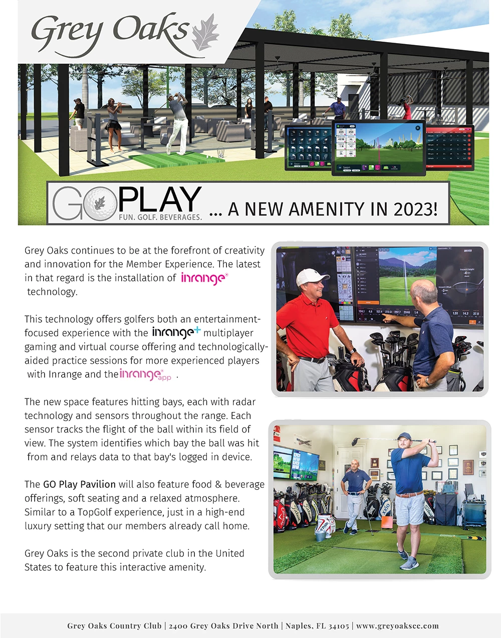 Nationwide we see an increased interest in the practice of golf as well as the melding of technology and “experiences”. The implementation of Inrange as an amenity provides a recreational and engaging experience for Members of all skill levels. This interactive golf experience provides fun for the social golfer yet allows our serious golfers the opportunity to analyze their practice performance and virtually play courses worldwide without leaving the comfort of Grey Oaks. Inrange was strategically introduced at Grey Oaks in January 2023 to aid tee time compaction due to our Pine Course renovation (one of 3 championship golf courses) which began in 2023.