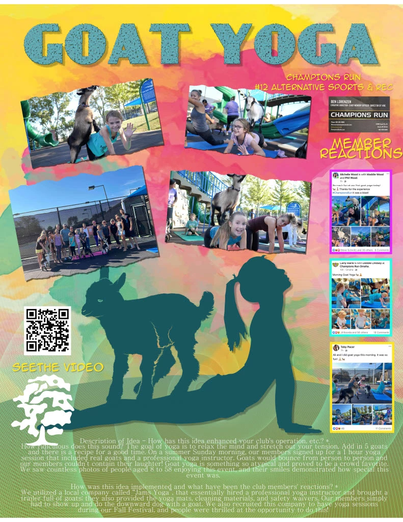 We utilized a local company called “Jams Yoga”, that essentially hired a professional yoga instructor and brought a trailer full of goats; they also provided the yoga mats, cleaning materials, and safety waivers. Our members simply had to show up and do the downward dog with a goat. We also recruited this company to have yoga sessions during our Fall Festival, and people were thrilled at the opportunity to do this!