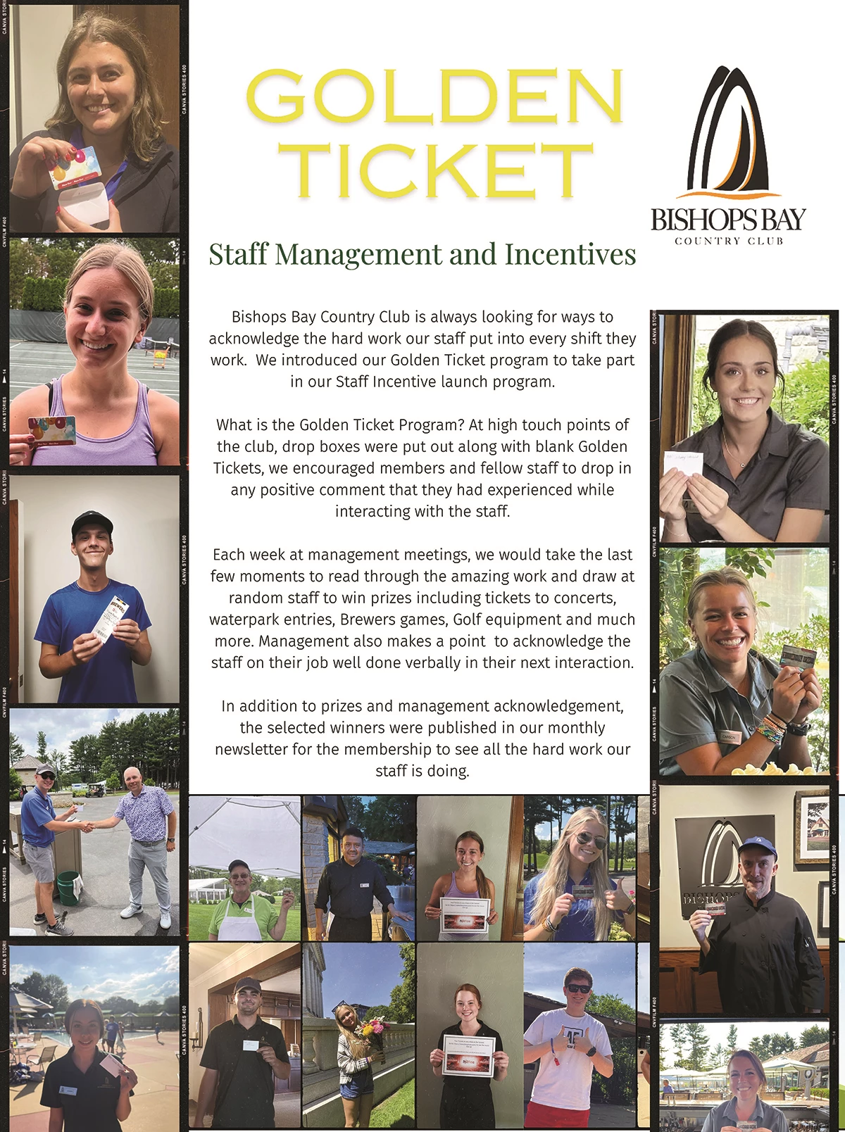 Bishops Bay Country Club is always looking for ways to acknowledge the hard work our staff put into every shift they work. We introduced our Golden Ticket program to take part in our Staff Incentive launch program. At high touch points of the club, drop boxes were put out along with blank Golden Tickets, we encouraged members and fellow staff to drop in any positive comment that they had experienced while interacting with the staff. Each week at management meetings, we would take the last few moments to read through the amazing work and draw at random staff to win prizes including tickets to concerts, waterpark entries, Brewers games, Golf equipment and much more. Management also makes the point to acknowledge the staff on their job well done verbally in their next interaction.