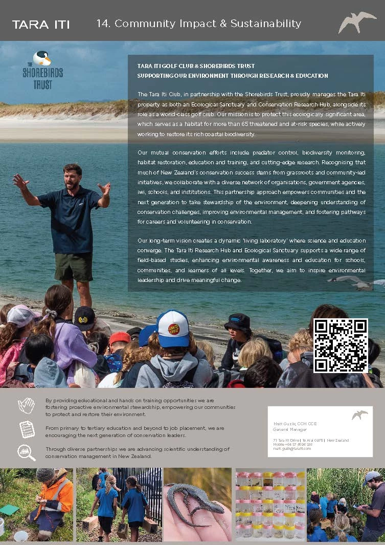 The Tara Iti Golf Club, in partnership with the Shorebirds Trust, proudly manages the Tara Iti property as both an Ecological Sanctuary and a Conservation Research Hub, alongside its role as a world-class golf course. Our mission is to protect this ecologically significant area, which serves as a vital habitat for over 65 endangered and at-risk species, while actively working to restore its rich coastal biodiversity.