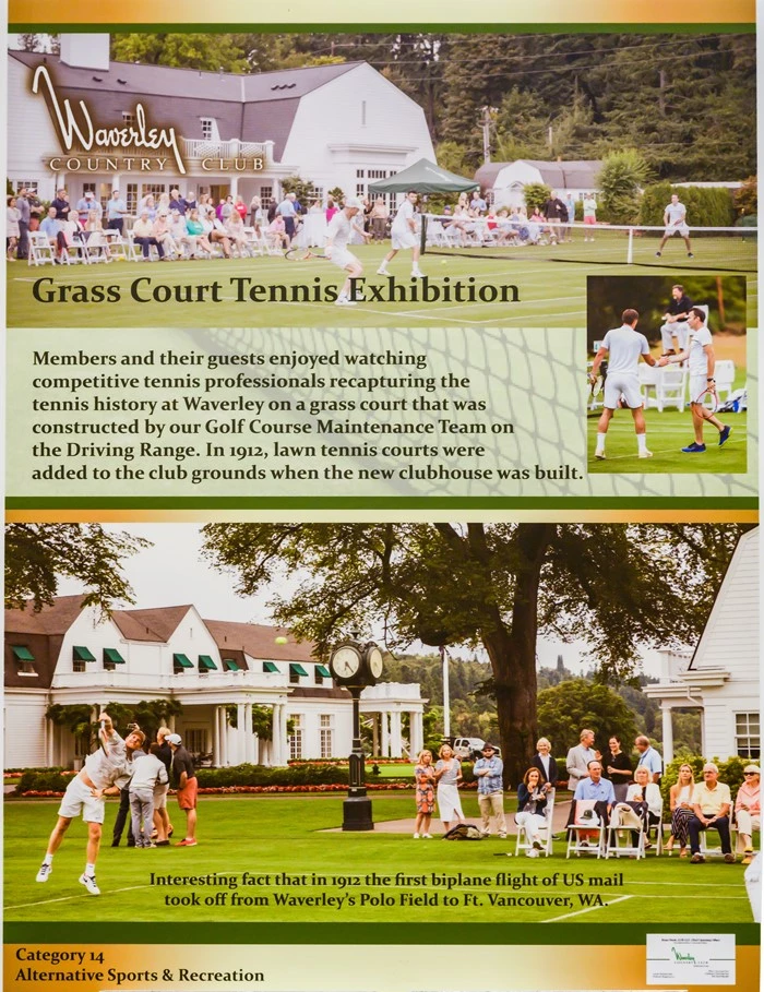 When Waverley's present clubhouse was constructed in 1913, the plans included several tennis courts next to the Willamette River. Shortly thereafter, tennis became more than a minor auxiliary at the Club and the members hosted the Oregon State Tennis Tournament. Today, the Club has only one remaining tennis court but there continues to be a strong core of devoted and accomplished players. A few years ago a newly formed Tennis Committee proposed grooming a grass tennis court on the Driving Range to host an exhibition match with known local tennis players and past touring professionals; the event came to fruition in 2019. The matches attracted an impressive number of spectators that enjoyed Wimbledon style food and libation.