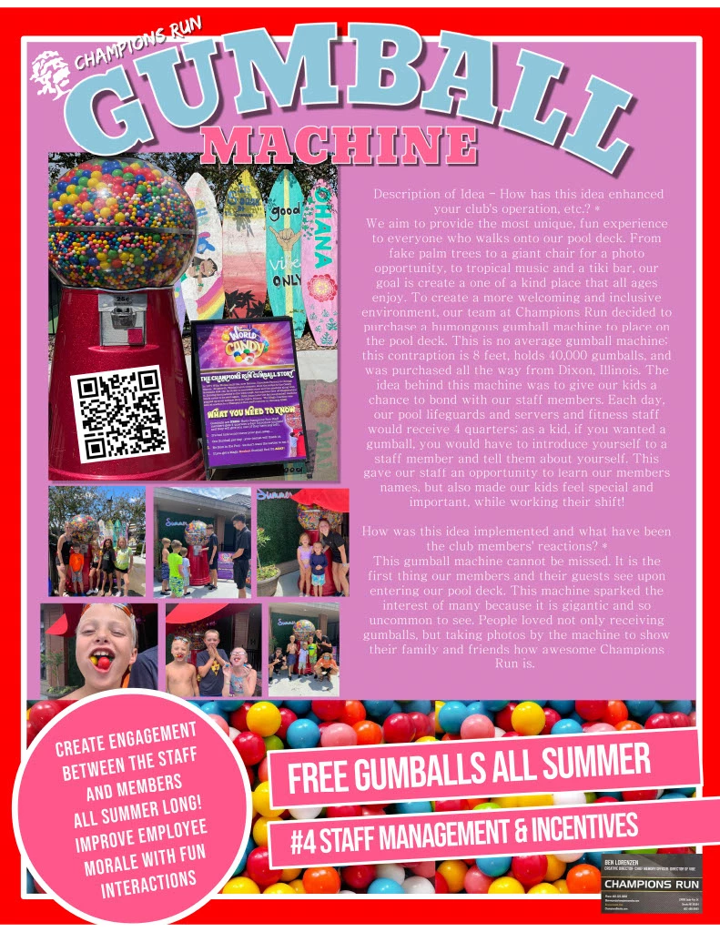 This gumball machine cannot be missed. It is the first thing our members and their guests see upon entering our pool deck. This machine sparked the interest of many because it is gigantic and so uncommon to see. People loved not only receiving gumballs, but taking photos by the machine to show their family and friends how awesome Champions Run is.