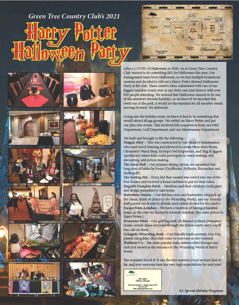 Going into the holiday season, we knew this event had to be something that would attract all age groups. The idea itself was easy to agree on, but then it took months of planning to pull off. Our staff met every week for three months planning out each detail for the Halloween bash. As one task was completed, new ones were added as the levels of creativity continued to grow. Each member of our management team was assigned specific tasks based on their skill sets. This included our chefs making chocolate frogs and a rice crispy snake, to our maintenance department re-creating Diagon Alley storefronts, and our marketing department crafting a sorting hat. We rose to the occasion, serving around 850 members over a three-hour evening. The members walked away impressed with all the activities, crafts, buffets, and games! We had multiple members tell us their expectations are set even higher for next year! All in all, it was a successful night for us here at Green Tree Country Club.