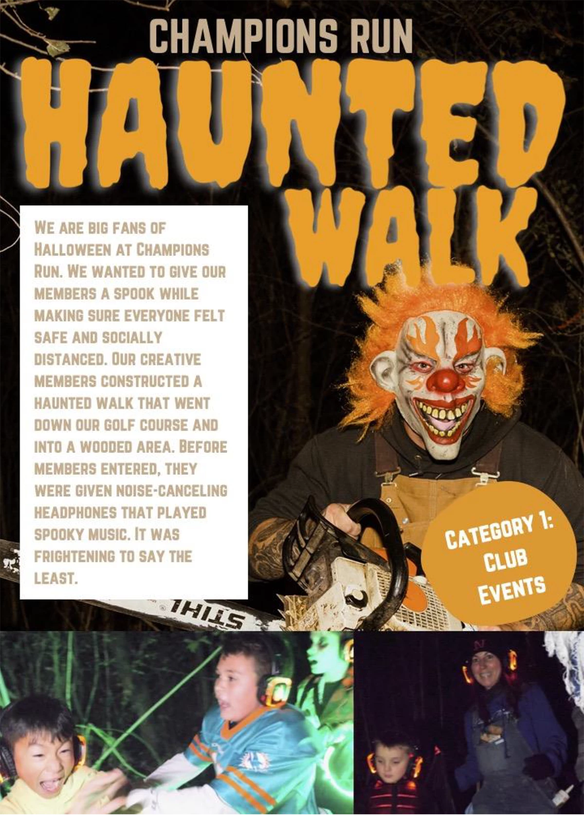 Our creative team put their minds together to construct a haunted walk, that began at the top of the driving range, and went all the way down to a forested area at the bottom. Those who dared to walk through were given noise-cancelling headphones that played spooky music, that were returned and cleaned at the end of each walk. Groups of 7 or 8 people were guided along the path and were greeted by clowns with chain saws, ghosts, and more. Our members appreciated the change in this tradition so that everyone could participate in this scary walk, if they dared.