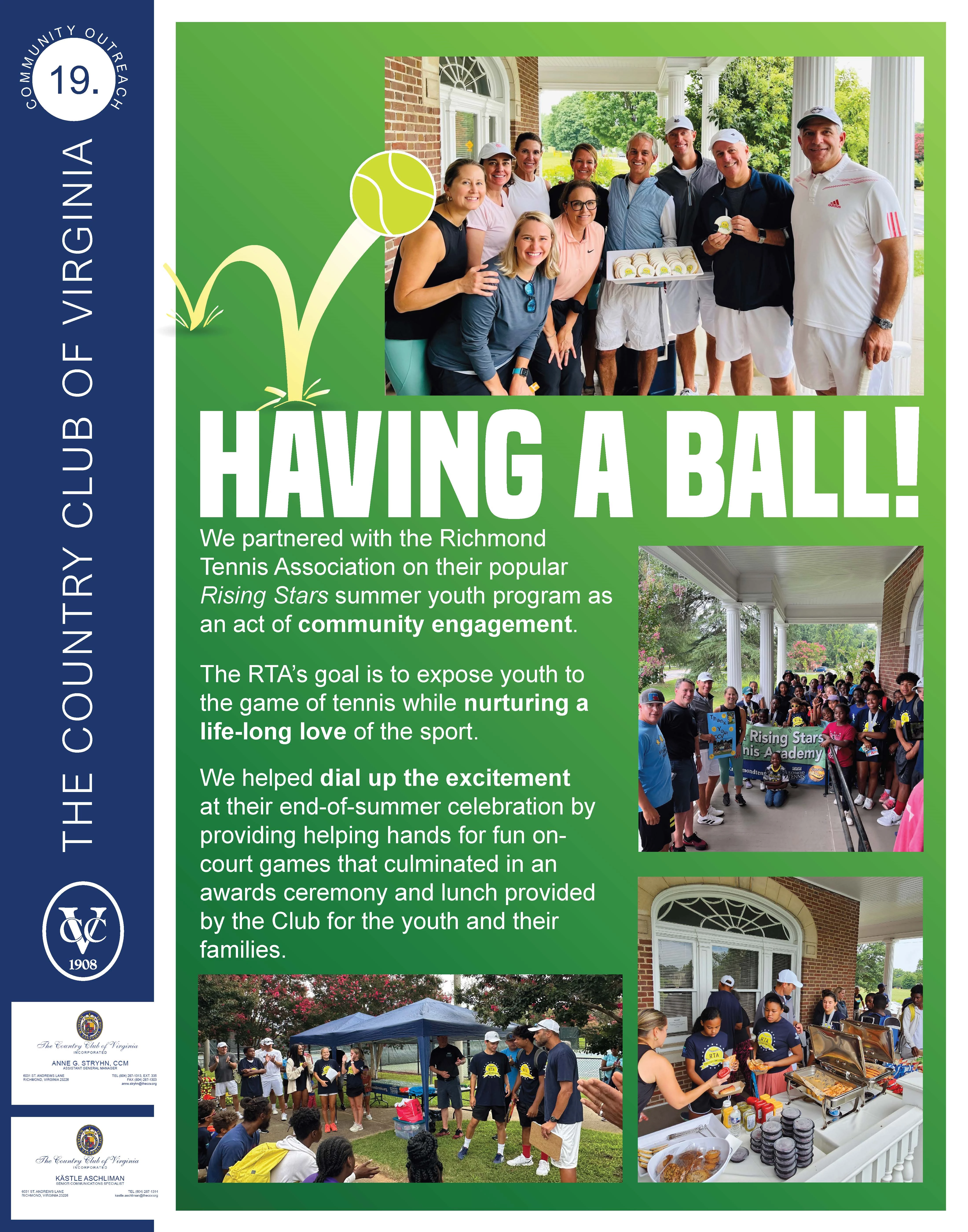 The Richmond Tennis Association (RTA), in partnership with the City of Richmond, offers the Rising Stars program for youth who might not otherwise be exposed to the game of tennis. Ten CCV members and employees led the kids through on-court games and drills that culminated in a post-season celebration awards ceremony and lunch provided by the Club.