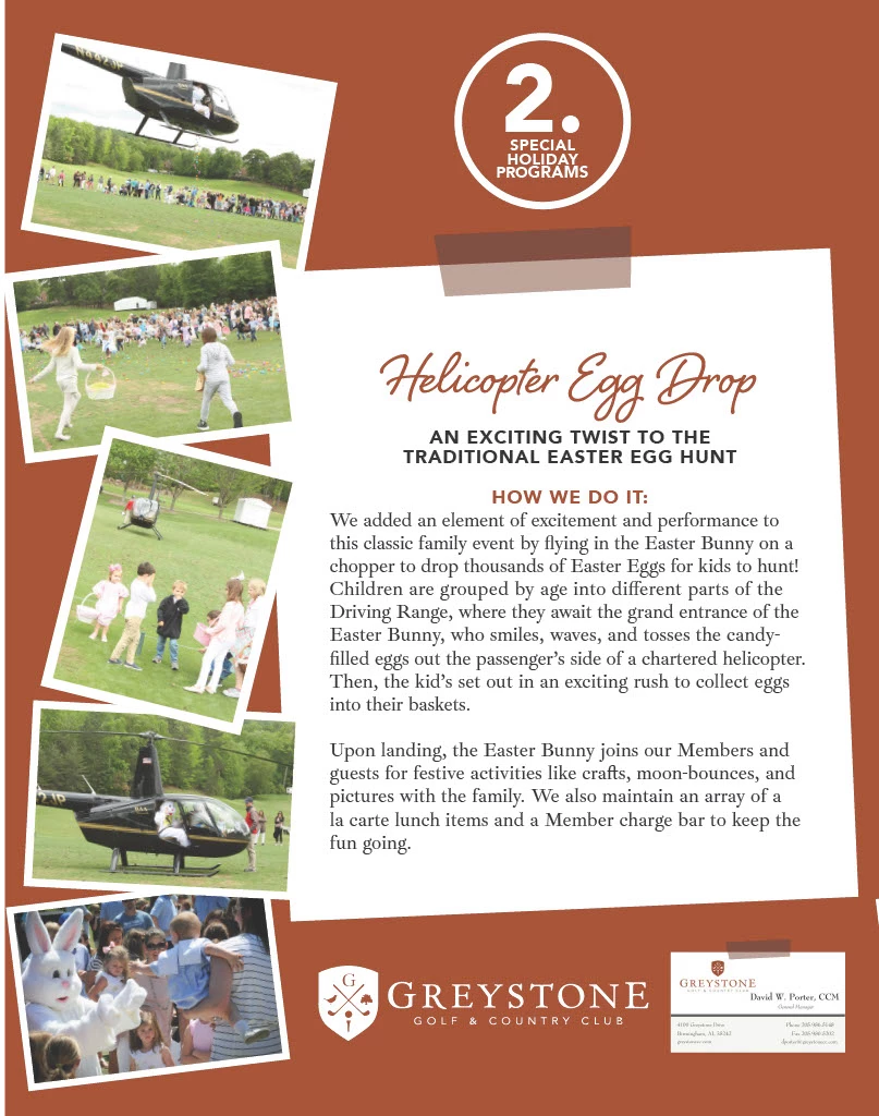 We hire a costumed bunny, charter a helicopter, and purchase prefilled eggs. The course maintenance crew marks out an area for the drop. Our members are wowed each year and cannot wait to see the bunny fly in!