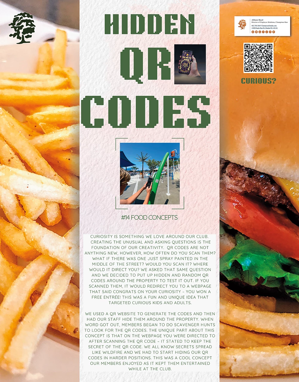 We used a qr website to generate The codes and then had our staff hide them around the property. When word got out, members began to do scavenger hunts to look for the QR codes. The unique part about this concept is that on the webpage you were directed to after scanning the QR code – it stated to keep the secret of the QR code. We all know secrets spread like wildfire and we had to start hiding our QR codes in harder positions. This was a cool concept our members enjoyed as it kept them entertained while at the club.