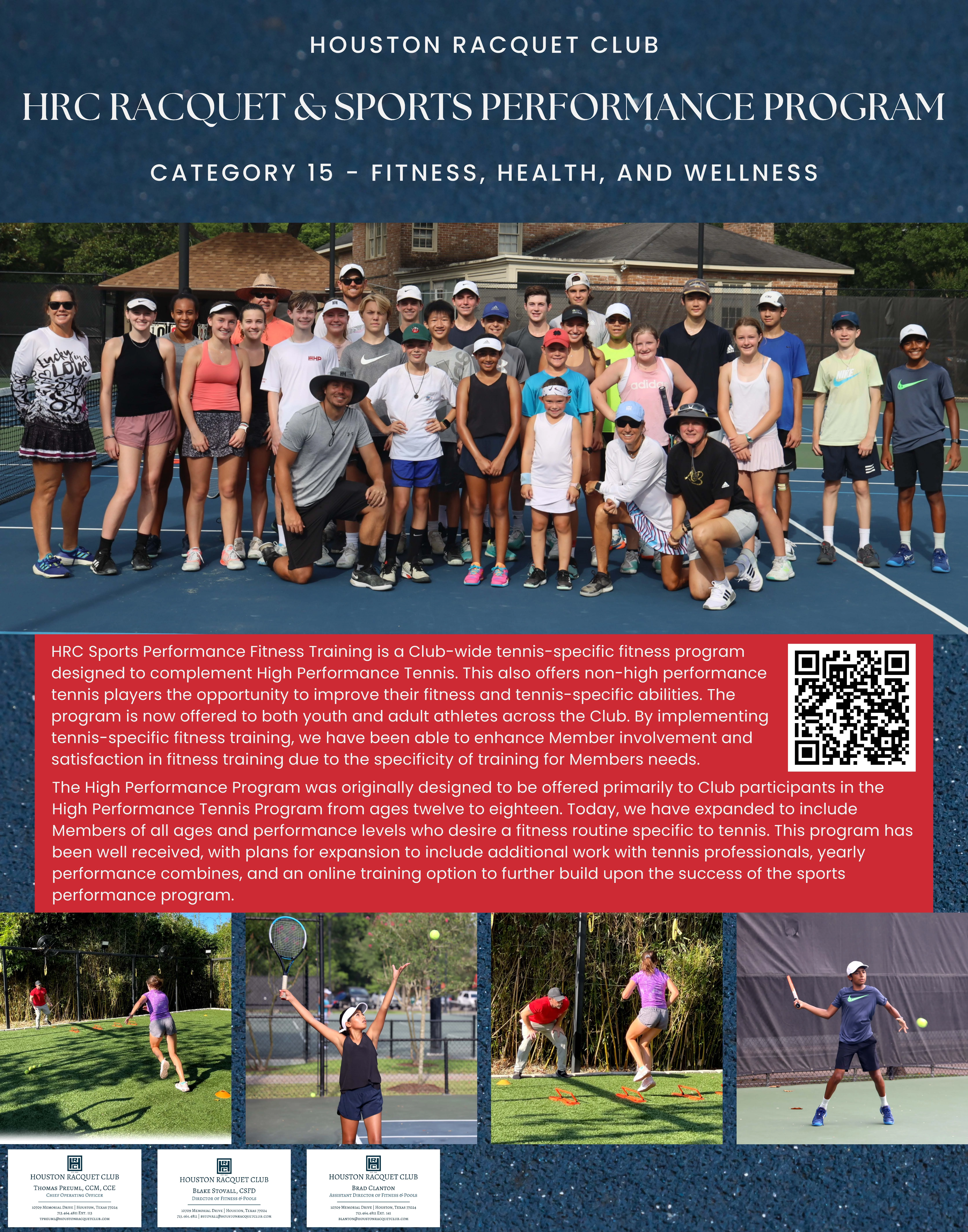 The High Performance Program was originally designed to be offered primarily to Club participants in the High Performance Tennis Program from ages twelve to eighteen. Today, we have expanded to include Members of all ages and performance levels who desire a fitness routine specific to tennis. This program has been well received, with plans for expansion to include additional work with tennis professionals, yearly performance combines, and an online training option to further build upon the success of the sports performance program.