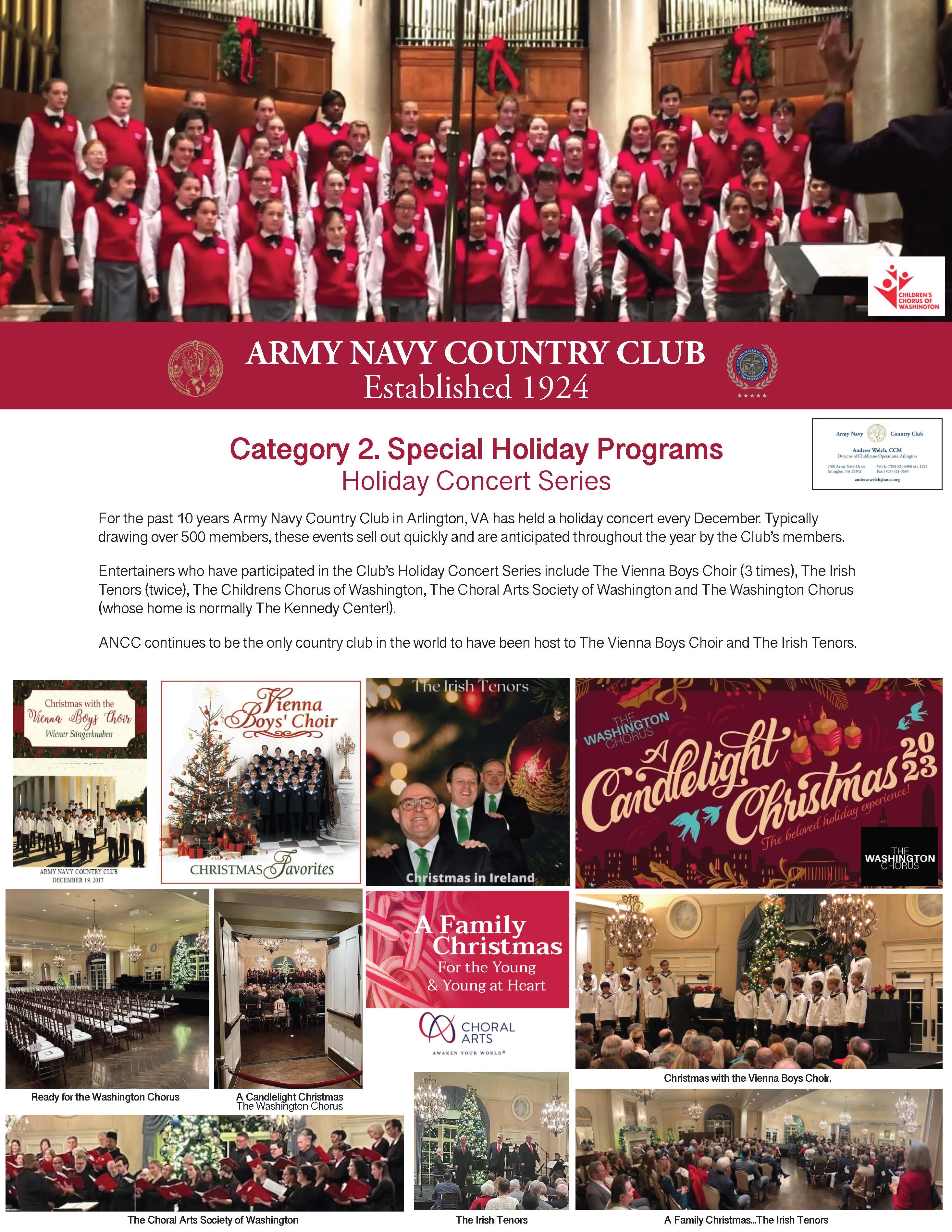 For the past 10 years we've held a holiday concert at our Arlington VA clubhouse every December. Entertainers who've participated include The Vienna Boys Choir (3 times), The Irish tenors (twice), The Children's Chorus of Washington, The Choral Arts Societ of Washington and The Washington Chorus. Members looks forward to these concerts throughout the year and they've become the highlight of our holiday season activities
