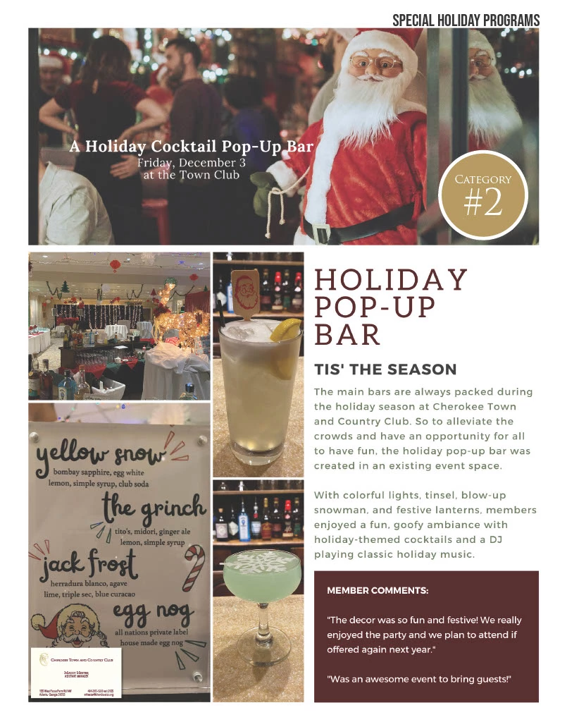 All clubs strive for membership satisfaction, especially during the holiday season. Cherokee has done a couple of “pop-up” events to ease the process of signing up for events and allow everyone to participate. As a result of the popularity of other “Pop Up” events, we created a Holiday themed “pop up” bar at both the Town Club and the Country Club!