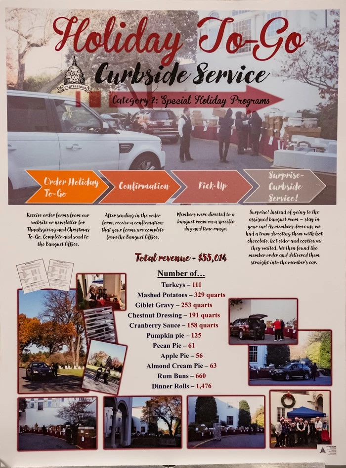 As our Members pull into the front drive they were greeted with directions on which pick-up area they were to go to as holiday music accompanied cheerful servers who were prepared with fresh holiday cookies, hot chocolate and hot apple cider. Tables were lined up on both sides of our main entrance organized alphabetically by the members last name which had all food orders including instructions associated with preparing or heating the food in their order. A manager reviewed each to-go via order form, each box was checked, and then loaded into the members car with a smile. We have not only elevated the Member experience but have also streamlined our operation for a more fluid and efficient experience for our staff. Our to-go orders exceeded over $50,000 in revenue for the season.