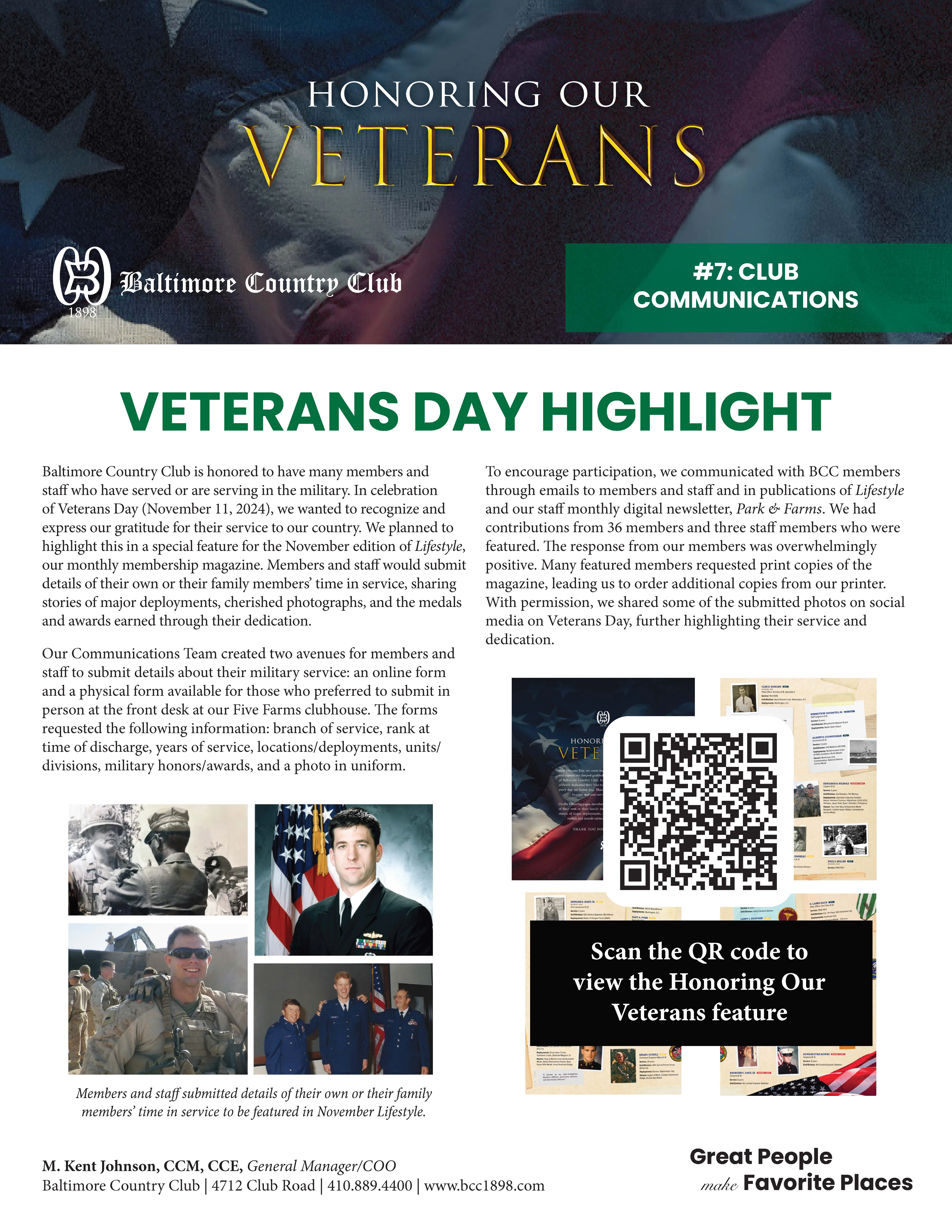 Our Communications Team created two avenues for members and staff to submit details about their military service: an online form and a physical form available for those who preferred to submit in person at the front desk at our Five Farms clubhouse. The forms requested the following information: branch of service, rank at time of discharge, years of service, locations/deployments, units/divisions, military honors/awards, and a photo in uniform.
