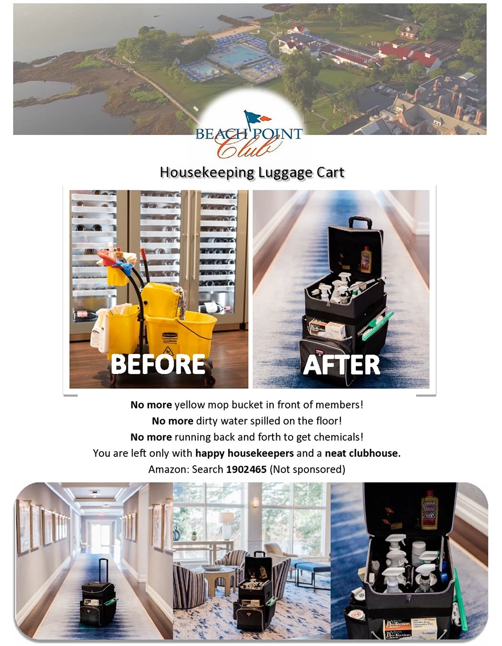 In the past, our housekeepers used yellow mop bucket as their cleaning cart. They carried it around the clubhouse even if they are not mopping. Recently we found this luggage cart on Amazon and used it to replace the mop bucket. It looks better and functions better.