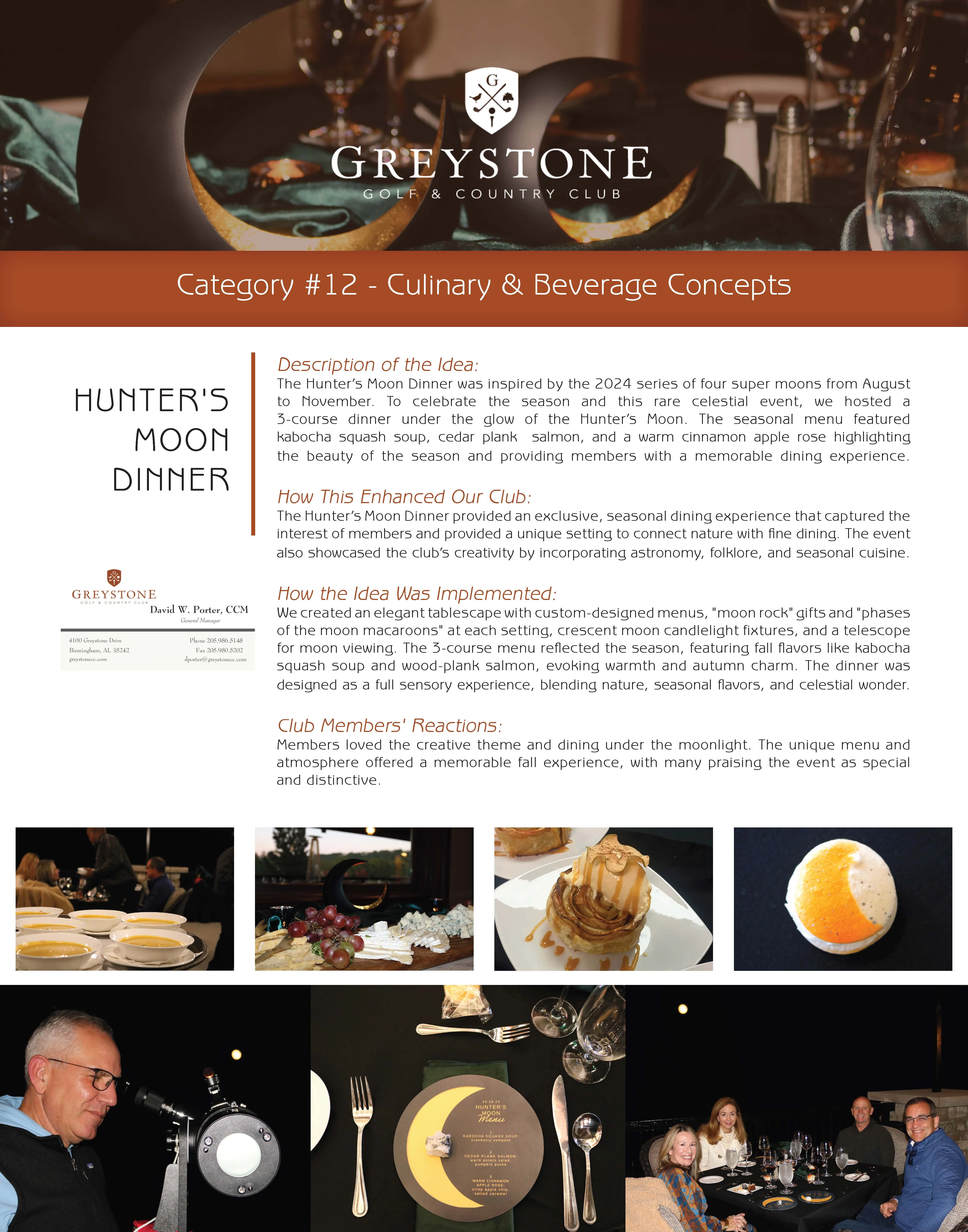 The Hunter’s Moon Dinner was inspired by the 2024 series of four super moons from August to November. To celebrate the season and this rare celestial event, we hosted a 3-course dinner under the glow of the Hunter’s Moon. The seasonal menu featured kabocha squash soup, cedar plank salmon, and a warm cinnamon apple rose highlighting the beauty of the season and providing members with a memorable dining experience. The Hunter’s Moon Dinner provided an exclusive, seasonal dining experience that captured the interest of members and provided a unique setting to connect nature with fine dining. The event also showcased the club’s creativity by incorporating astronomy, folklore, and seasonal cuisine.