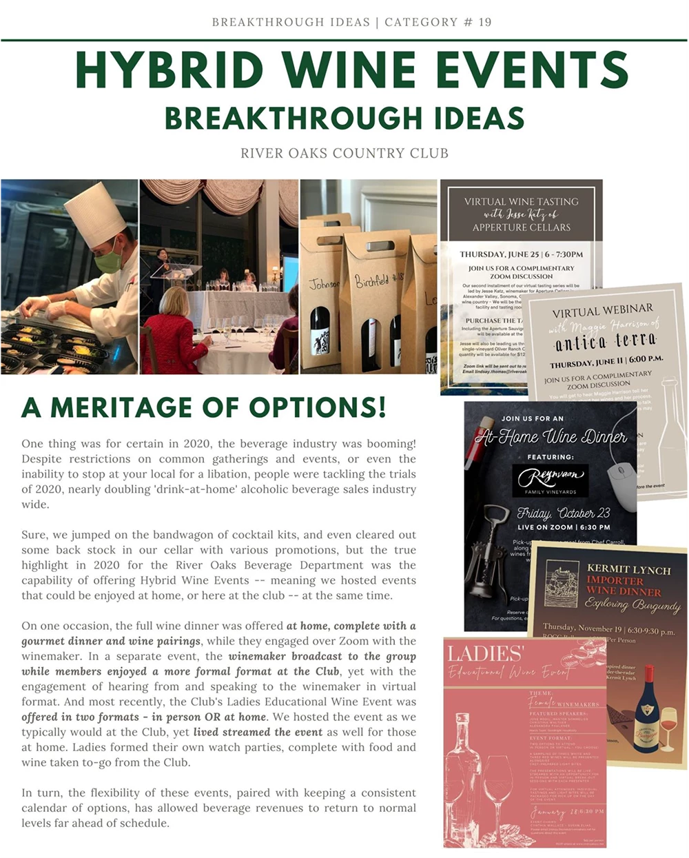 Sure, we jumped on the bandwagon of cocktail kits, and even cleared out some back stock in our cellar with various promotions, but the true highlight in 2020 for the River Oaks Beverage Department was the capability of offering Hybrid Wine Events -- meaning we hosted events that could be enjoyed at home, or here at the club -- at the same time.