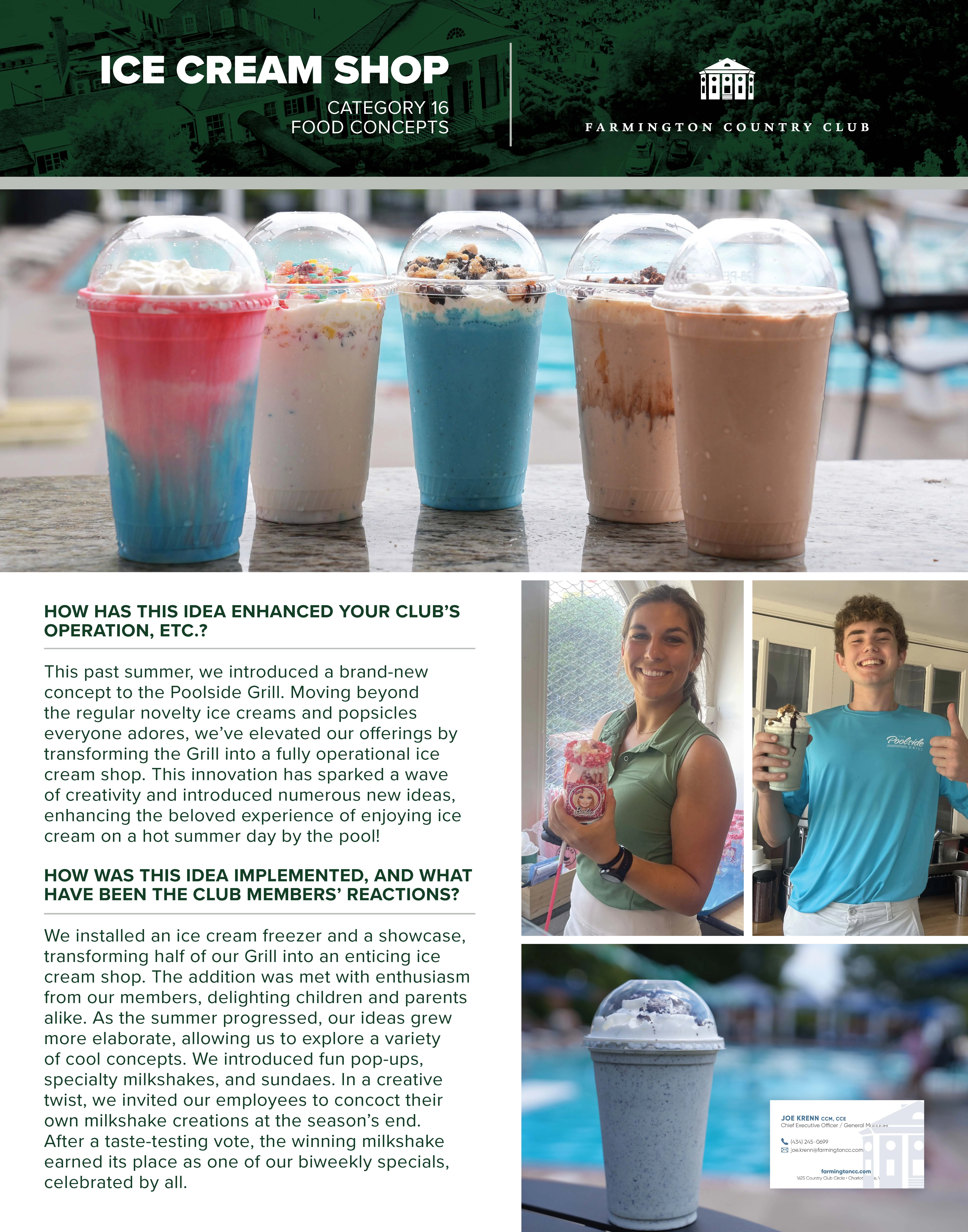 We installed an ice cream freezer and a showcase, transforming half of our Grill into an enticing ice cream shop. The addition was met with enthusiasm from our members, delighting children and parents alike. As the summer progressed, our ideas grew more elaborate, allowing us to explore a variety of cool concepts. We introduced fun pop-ups, specialty milkshakes, and sundaes. In a creative twist, we invited our employees to concoct their own milkshake creations at the season’s end. After a taste-testing vote, the winning milkshake earned its place as one of our biweekly specials, celebrated by all.