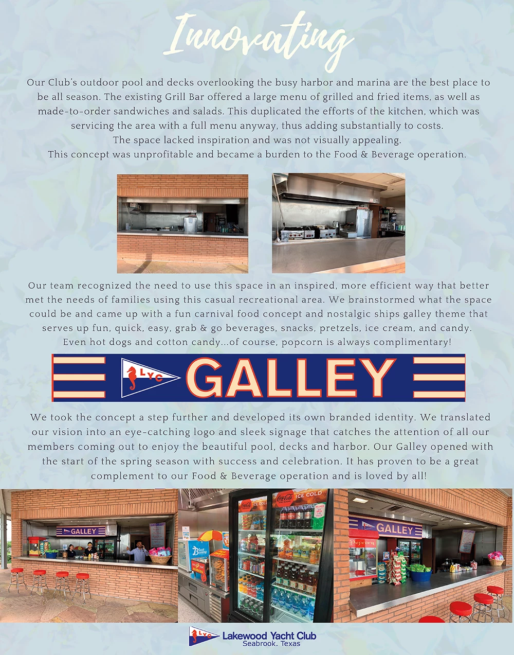 Our management team brainstormed ideas and looked for ways to better utilize this old space. We worked with a graphic designer to translate our vision into a branded theme complete with it's own logo. We opened at the beginning of the season to great success. The membership and our team are very proud of their new Galley concept and enjoy stopping by for a snack to enjoy around the pool or even to stock their boat for a day trip.
