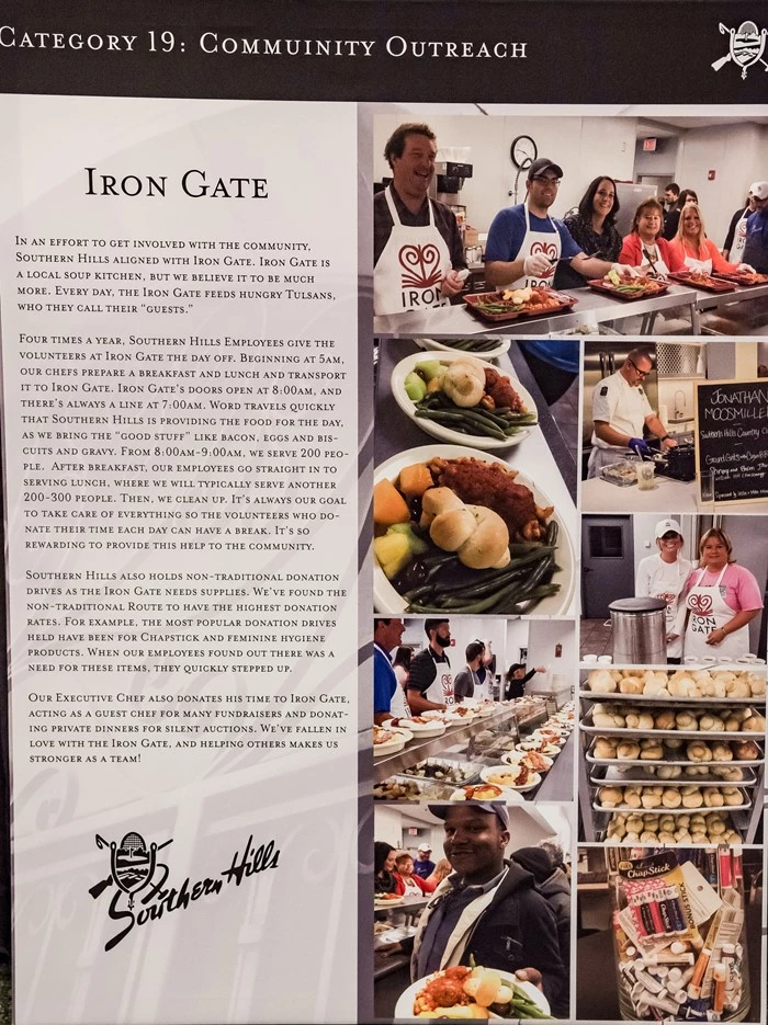 Our Executive Chef, Johnathan Moosemiller CMC, has always had a giving side. He was involved with Iron gate previously and has sense gotten the club as a whole involved. Staff sign up to volunteer for the morning, afternoon or both. Many individuals choose to do both. The day begins at 5am, when the culinary team comes to SHCC to cook and prepare all the food. It is then transported to the Iron Gate building in downtown Tulsa, where staff and management feed up to 400 people for breakfast and lunch. Several members are involved with community outreach, as well as Iron Gate specifically. Iron gate, as well as our members send each staff member that volunteers their time, a letter thanking them for their hard work and contribution. In the eyes of our members, it is community outreach like this at the hands of our staff, that make the Southern Hills experience even better.