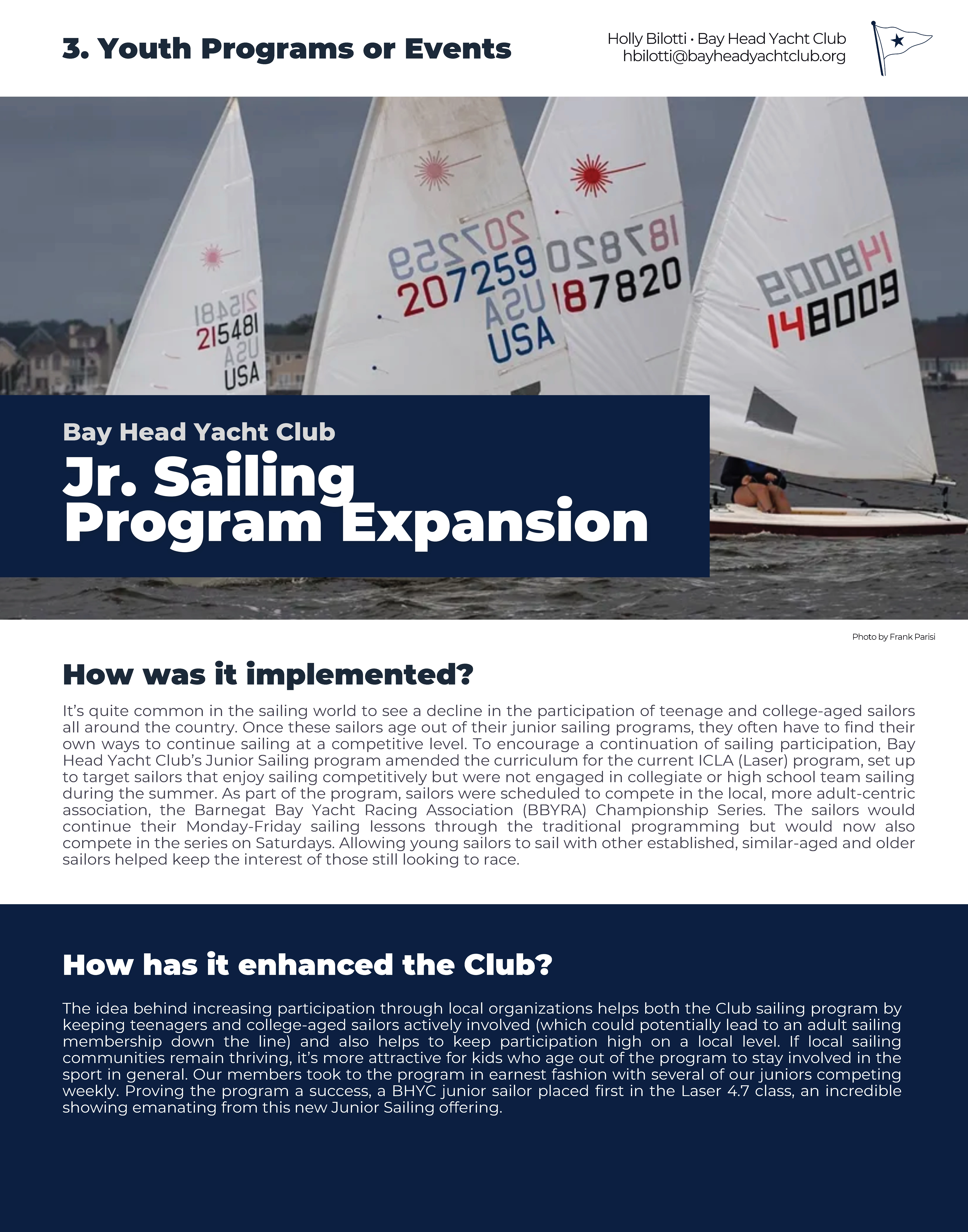 The idea behind increasing participation through local organizations helps both the Club sailing program by keeping teenagers and college-aged sailors actively involved (which could potentially lead to an adult sailing membership down the line) and also helps to keep participation high on a local level. If local sailing communities remain thriving, it’s more attractive for kids who age out of the program to stay involved in the sport in general. Our members took to the program in earnest fashion with several of our juniors competing weekly. Proving the program a success, a BHYC junior sailor placed first in the Laser 4.7 class, an incredible showing emanating from this new Junior Sailing offering.