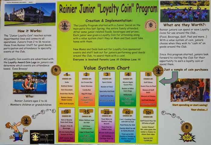 Rainier juniors can spend or save Loyalty coins for use around the Club (Food, Beverage, Golf, Pool and more...) With a value system of coin worth, junior choose when they wish to "cash in" on goods around the Club.