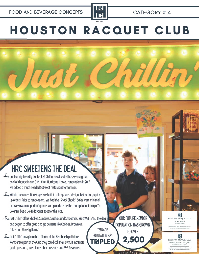 Renovations done in 2017, after Hurricane Harvey allowed us to create this designated space for the kids! Just Chillin’ features everything that kids love from shakes, ice cream floats and desserts hand crafted by our Chef. It’s no longer the parent’s bringing the children to the Club. It’s the children bringing the parents!