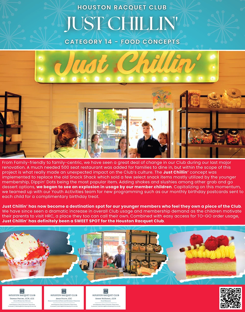 Capitalizing on this momentum, we teamed up with our Youth Activities team for new programming such as our monthly birthday postcards sent to each child for a complimentary birthday treat. Just Chillin’ has now become a destination spot for our younger members who feel they own a piece of the Club. We have since seen a dramatic increase in overall Club usage and membership demand as the children motivate their parents to visit HRC, a place they too can call their own. Combined with easy access for TO-GO order usage, Just Chillin’ has been a SWEET SPOT for the Houston Racquet Club.