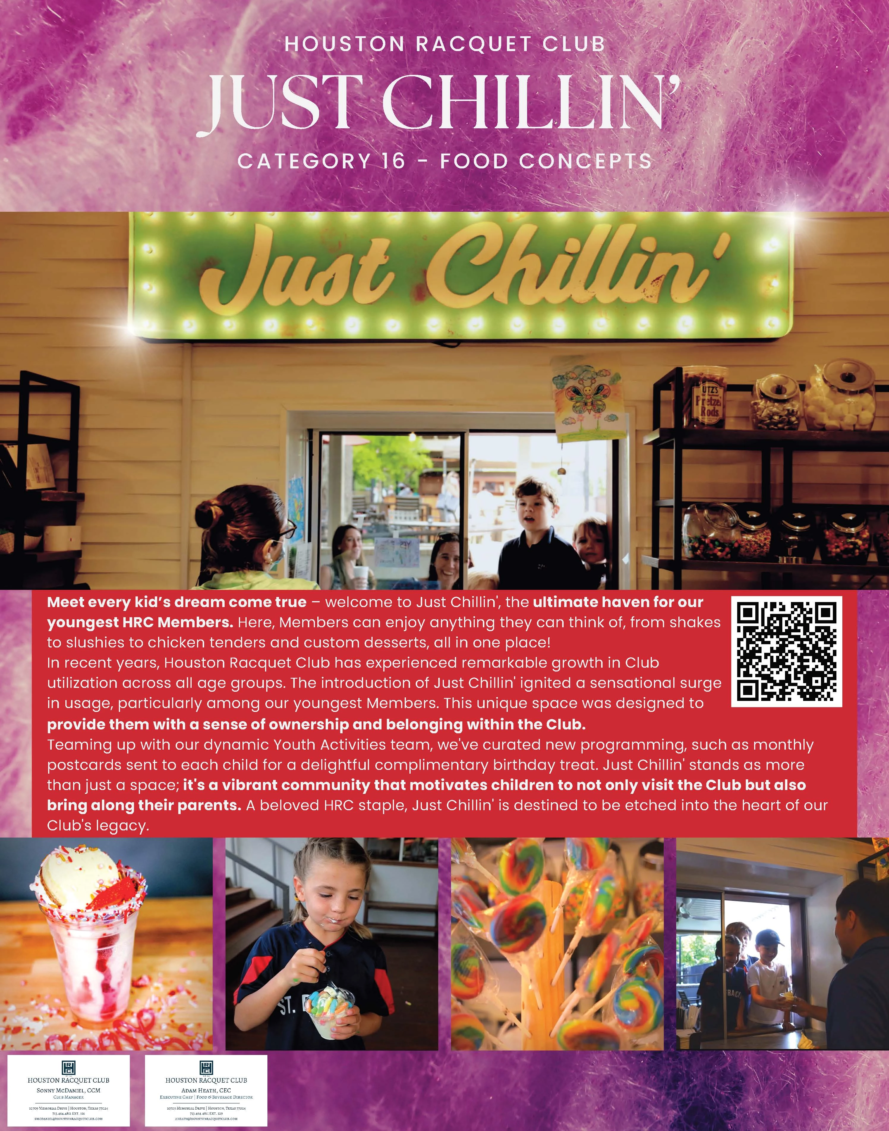 Just Chillin' is the ultimate haven for our youngest HRC Members. Here, Members can enjoy anything they can think of, from shakes to slushies to chicken tenders and custom desserts, all in one place! In recent years, Houston Racquet Club has experienced remarkable growth in Club utilization across all age groups. The introduction of Just Chillin' ignited a sensational surge in usage, particularly among our youngest Members. This unique space was designed to provide them with a sense of ownership and belonging within the Club.