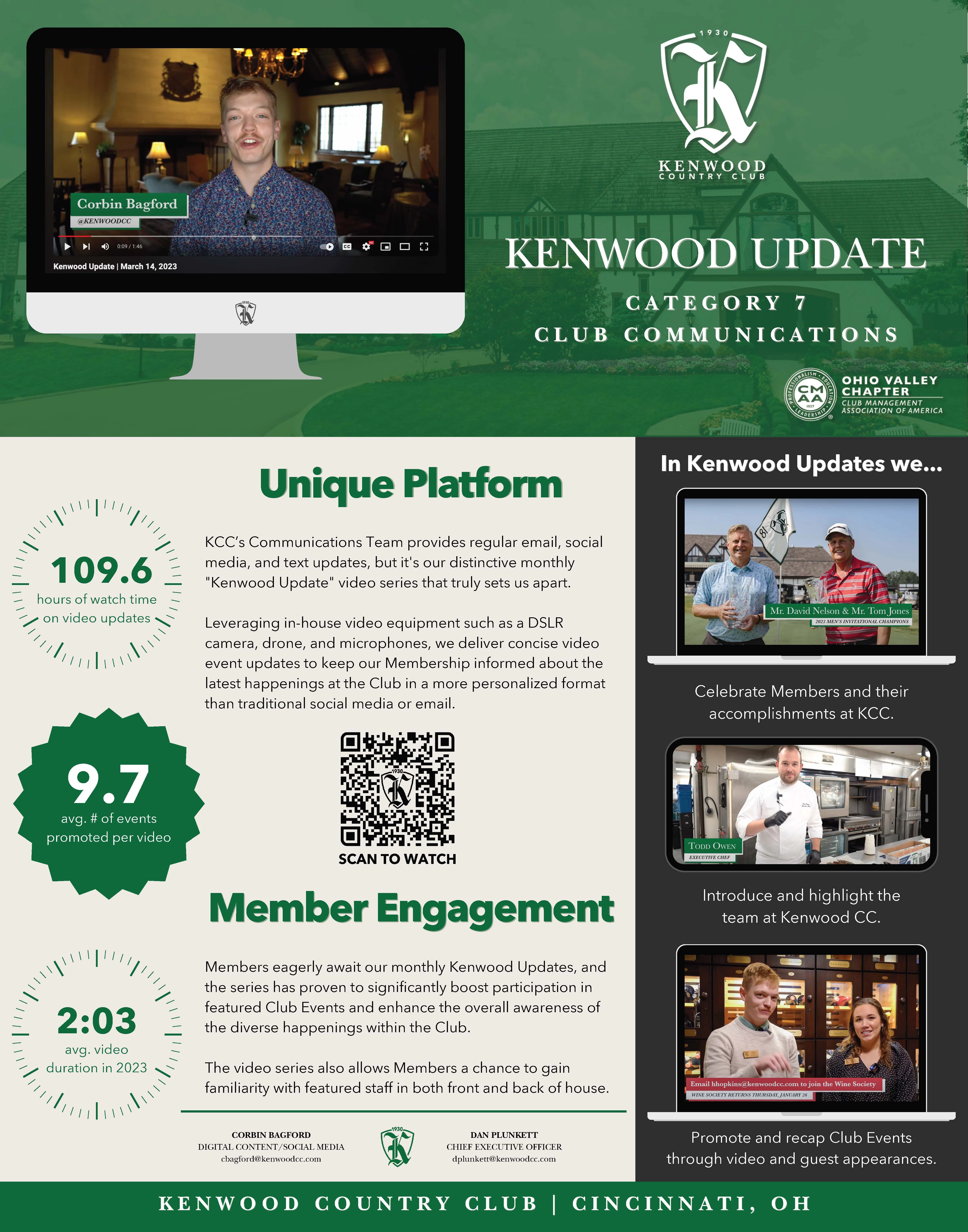 The "Kenwood Update" video series, initially launched ahead of a busy events month in spring 2022, has become a monthly fixture in our communications calendar due to the overwhelmingly positive reception from Members. The Kenwood Update is linked via email, but it's also shared to our private Facebook Group, Instagram "Close Friends," and YouTube, maximizing reach to Members on different platforms. Members' heightened participation in featured Club Events and increased awareness of diverse activities within the Club underscore the success of this initiative. Beyond increased participation in Club Events, the series has successfully fostered a stronger sense of community by allowing Members to connect with featured staff and have a new method of keeping up with what’s going on at KCC. Overall, the "Kenwood Update" has effectively enhanced communication, engagement, and the overall member experience at Kenwood Country Club.