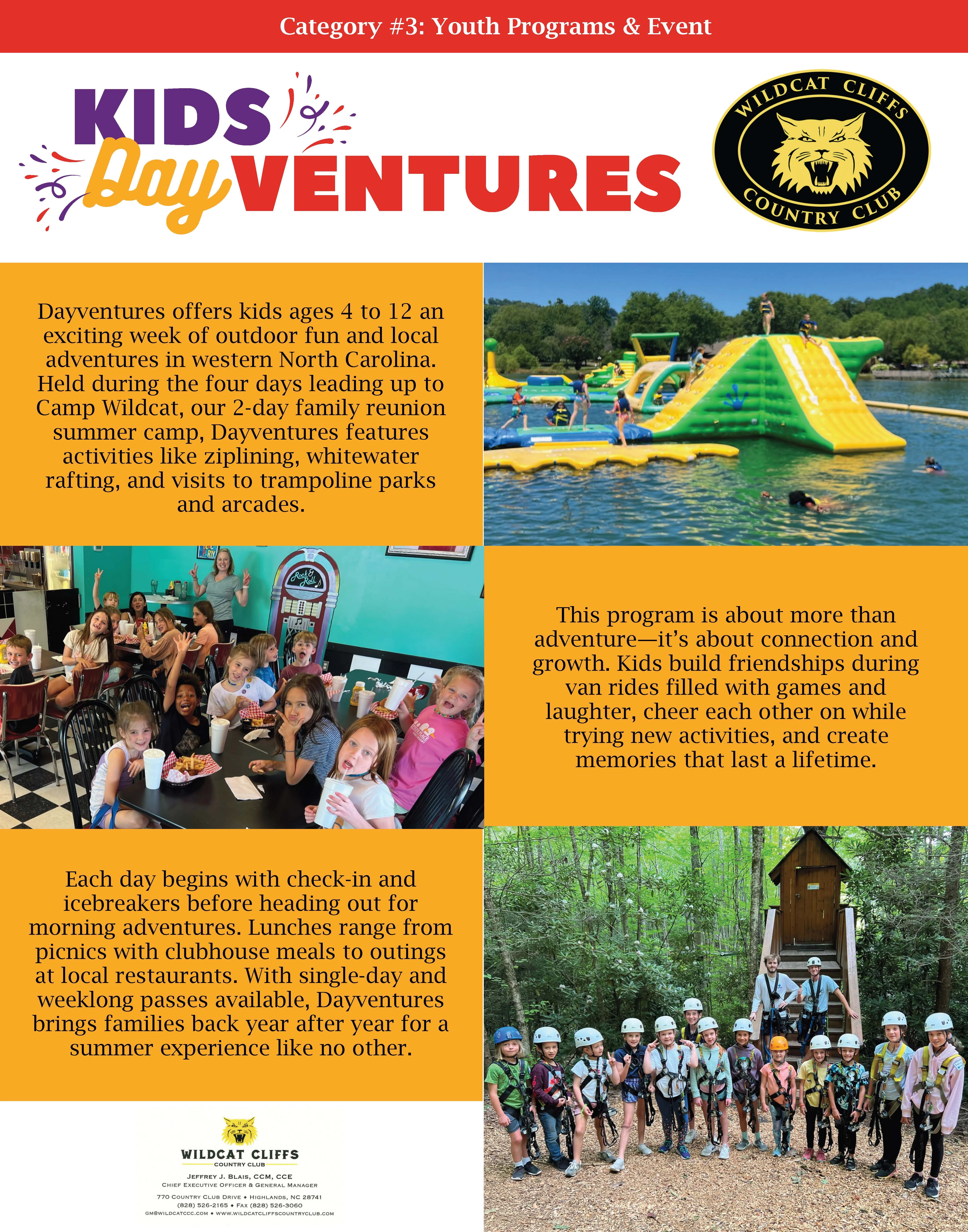 Dayventures offers kids ages 4 to 12 an exciting week of outdoor fun and local adventures in western North Carolina. Held during the four days leading up to Camp Wildcat, our 2-day family reunion summer camp, Dayventures features activities like ziplining, whitewater rafting, and visits to trampoline parks and arcades.