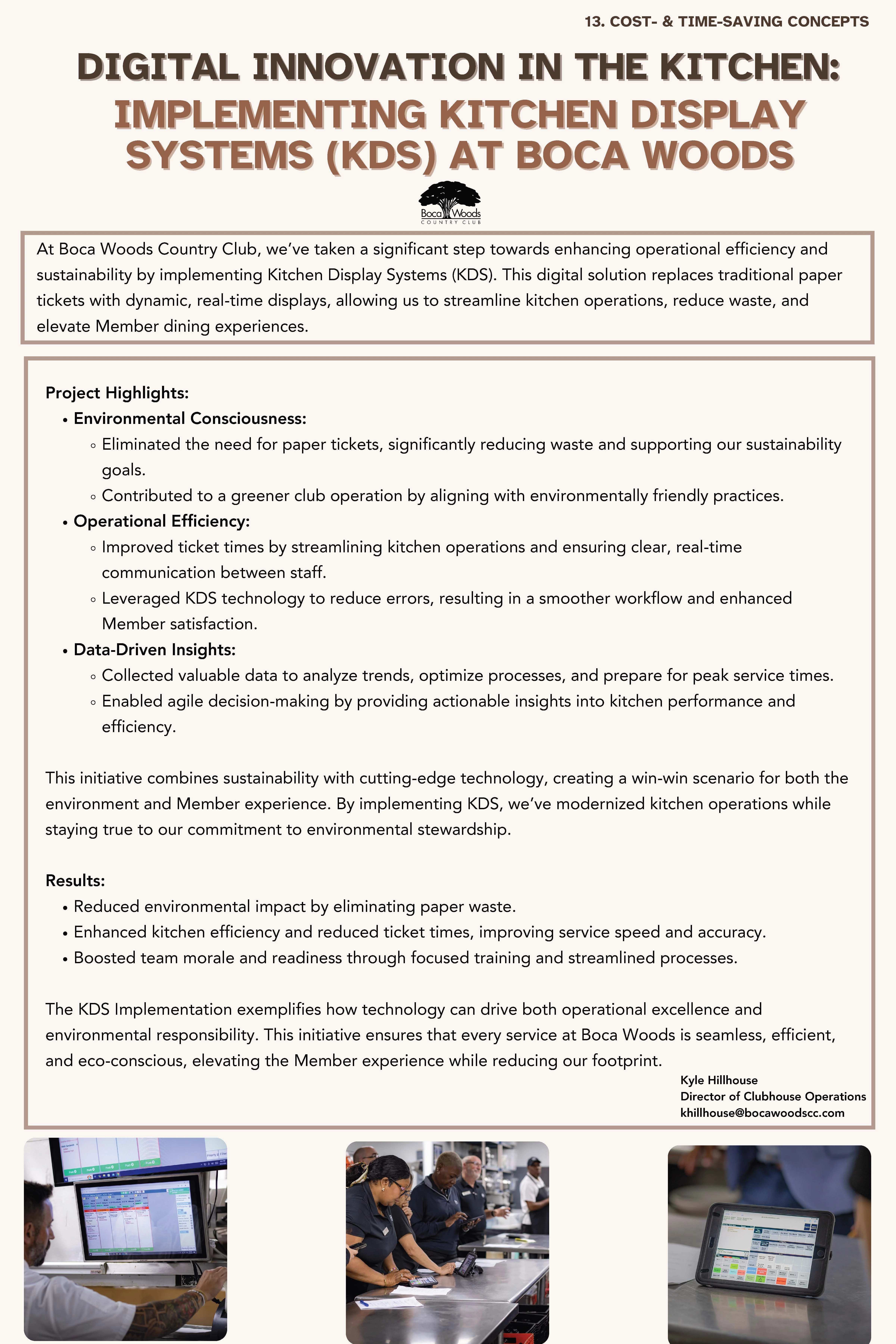 KDS improved kitchen operations by streamlining ticket times, reducing errors, and aligning with the club’s sustainability goals.