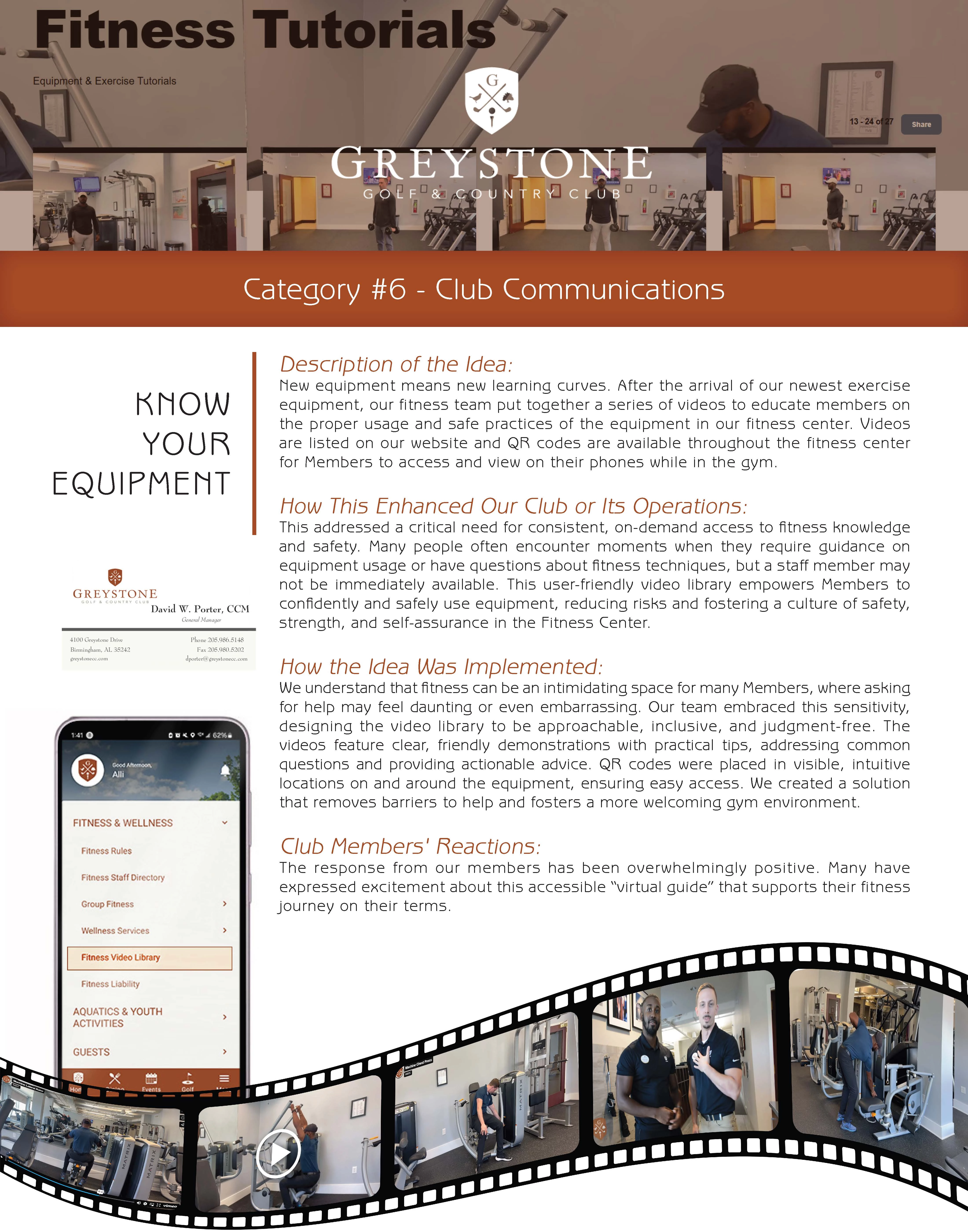 New equipment means new learning curves. After the arrival of our newest exercise equipment, our fitness team put together a series of videos to educate members on the proper usage and safe practices of the equipment in our fitness center. Videos are listed on our website and QR codes are available throughout the fitness center for Members to access and view on their phones while in the gym. This addressed a critical need for consistent, on-demand access to fitness knowledge and safety. Many people often encounter moments when they require guidance on equipment usage or have questions about fitness techniques, but a staff member may not be immediately available. This user-friendly video library empowers Members to confidently and safely use equipment, reducing risks and fostering a culture of safety, strength, and self-assurance in the Fitness Center.