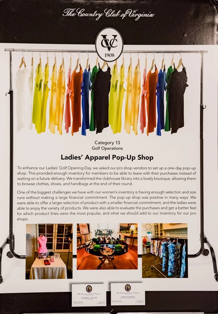 One of the biggest challenges we have with our women’s inventory is having enough selection and size runs without making a large financial commitment. The Pop Up shop was positive in many ways - we were able to offer a larger selection of product with a smaller financial commitment, the ladies were able to enjoy the variety of products and the ladies could leave with their purchases that day. We were also able to evaluate the purchases and get a better feel for which product lines were the most popular and what we should add to our inventory for our pro shops. The Pop Up Shop was very well received by our members.