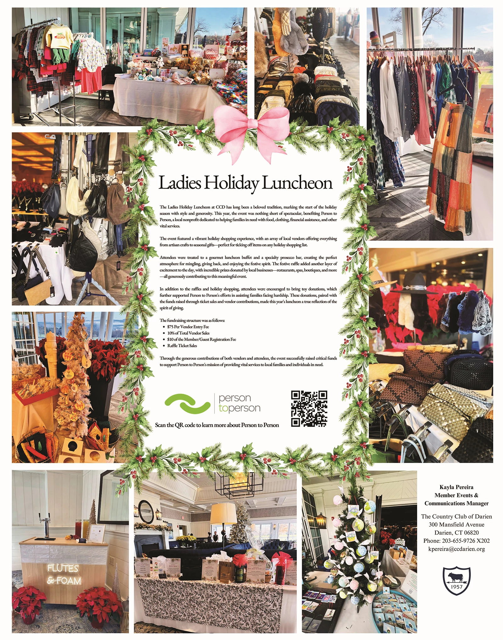 The Ladies Holiday Luncheon at CCD not only celebrates the start of the holiday season but fosters a spirit of community and giving. The event featured a vibrant holiday shopping experience from local vendors, specialty prosecco bar, gourmet luncheon, raffles and toy drive. By partnering this year with Person to Person, the event created an opportunity for members to come together in support of a local cause, strengthening the club's connection in the broader community.