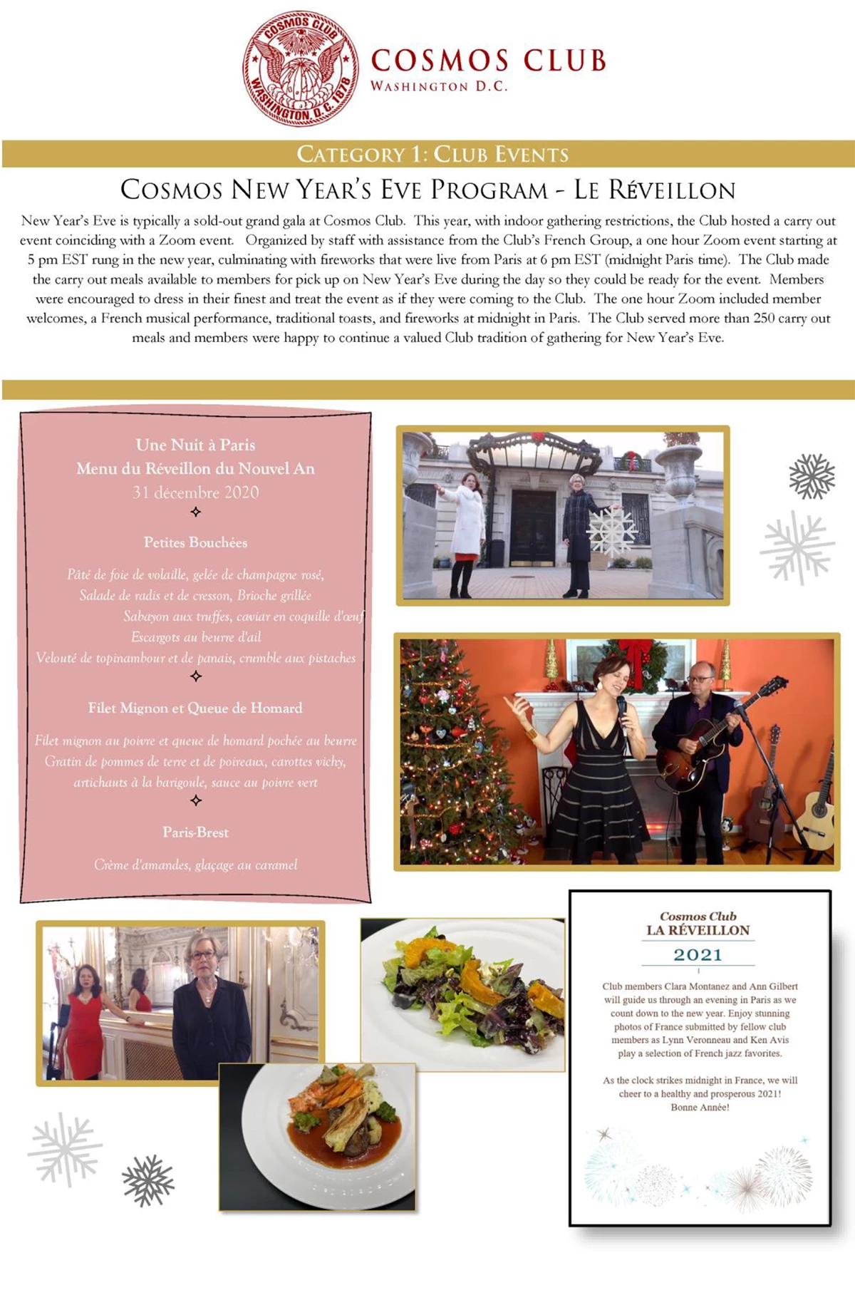 New Year’s Eve is typically a sold-out grand gala at Cosmos Club. This year, with indoor gathering restrictions, the Club hosted a carry out event coinciding with a Zoom event. Organized by staff with assistance from the Club’s French Group, a one hour Zoom event starting at 5 pm EST rung in the new year, culminating with fireworks that were live from Paris at 6 pm EST (midnight Paris time).