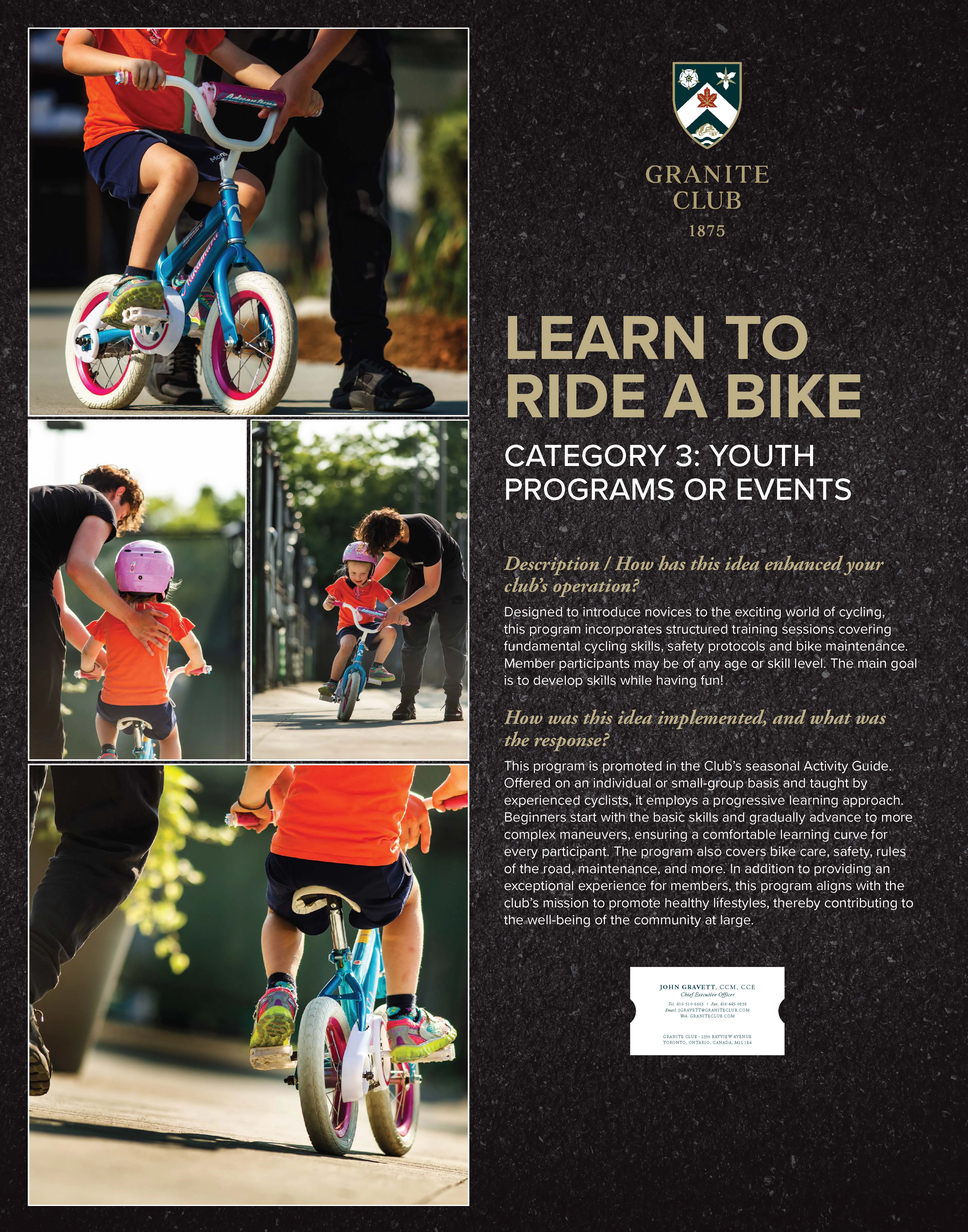This program is promoted in the Club’s seasonal Activity Guide. Offered on an individual or small-group basis and taught by experienced cyclists, it employs a progressive learning approach. Beginners start with the basic skills and gradually advance to more complex maneuvers, ensuring a comfortable learning curve for every participant. The program also covers bike care, safety, rules of the road, maintenance, and more. In addition to providing an exceptional experience for members, this program aligns with the club’s mission to promote healthy lifestyles, thereby contributing to the well-being of the community at large.