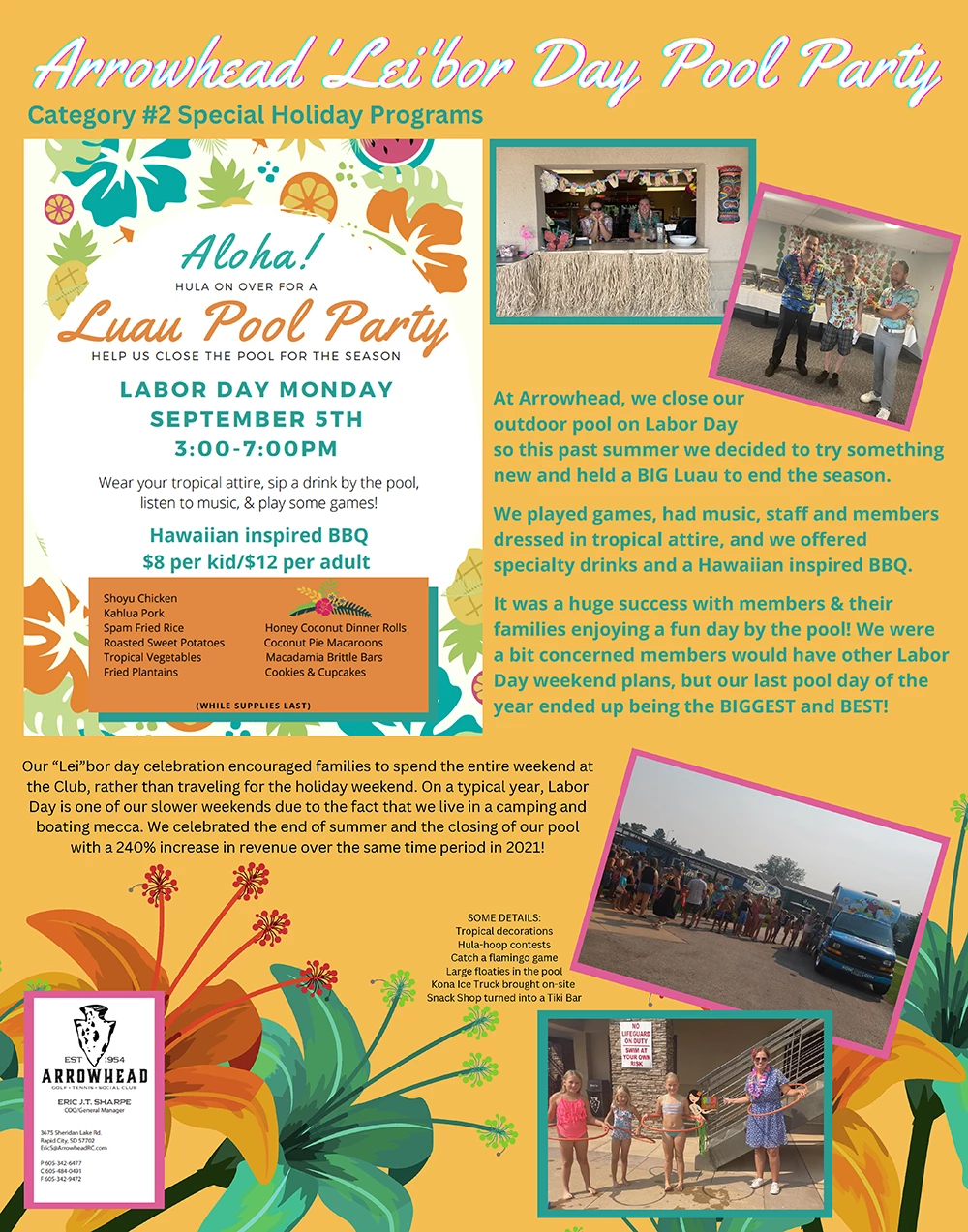 Our “Lei”bor day celebration encouraged families to spend the entire weekend at the Club, rather than traveling for the holiday weekend. On a typical year, Labor Day is one of our slower weekends due to the fact that we live in a camping and boating mecca. We celebrated the end of summer and the closing of our pool with a 240% increase in revenue over the same time period in 2021!