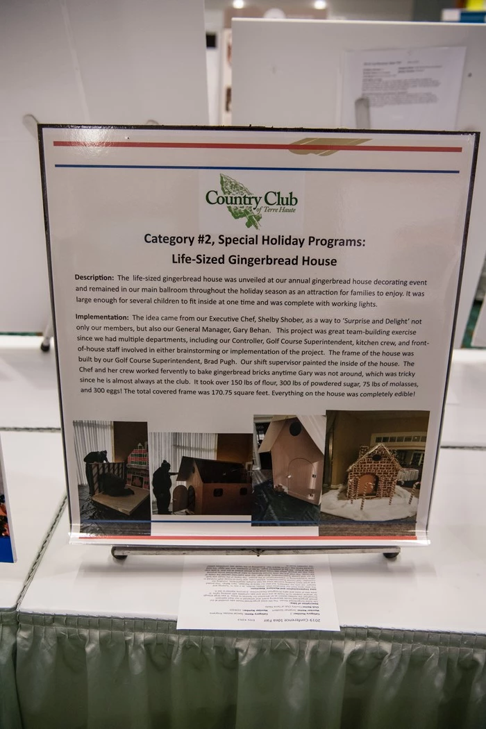 The idea came from our Executive Chef, Shelby Shober, as a way to ‘Surprise and Delight’ not only our members, but also our General Manager, Gary Behan. This project was great team-building exercise since we had multiple departments, including our Controller, Golf Course Superintendent, kitchen crew, and front-of-house staff involved in either brainstorming or implementation of the project. The frame of the house was built by our Golf Course Superintendent, Brad Pugh. Our shift supervisor painted the inside of the house. The Chef and her crew worked fervently to bake gingerbread bricks anytime Gary was not around, which was tricky since he is almost always at the club. It took over 150 lbs of flour, 300 lbs of powdered sugar, 75 lbs of molasses, and 300 eggs! The total covered frame was 170.75 square feet. Everything on the house was completely edible! The members loved it!